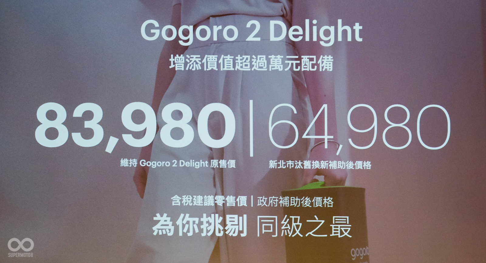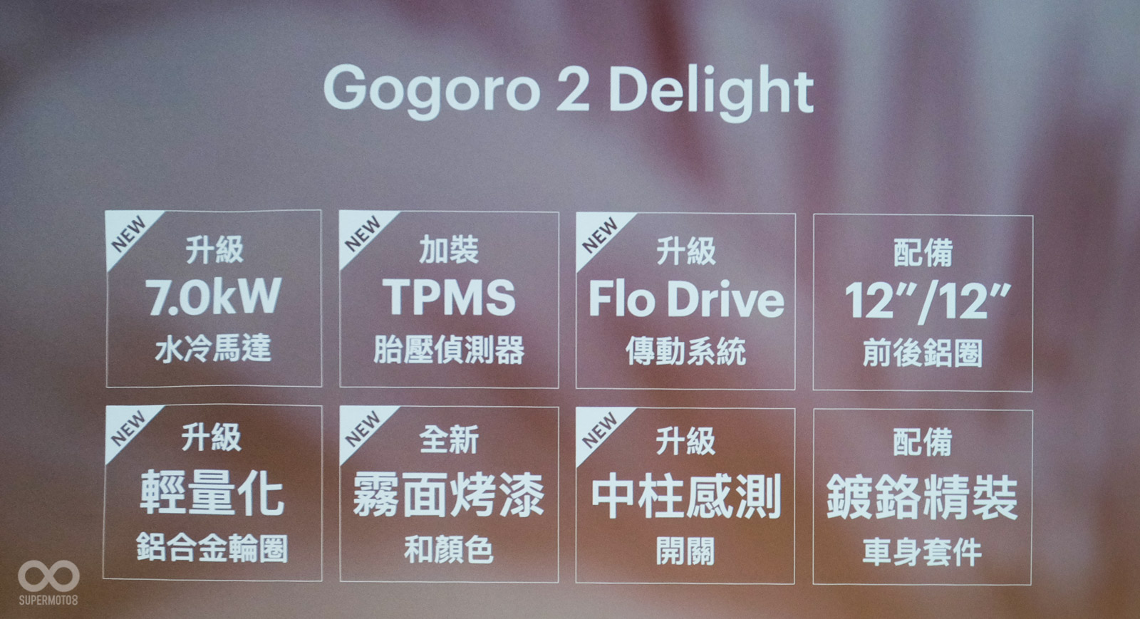 配色溫馨的Gogoro 2 Delight也在本次的升級清單中,幾乎包含前述的所有升級例如:7Kw馬達、胎壓偵測器、FLO Drive、12吋輪圈輕量處理、中柱感應開關,建議售價83,980元。