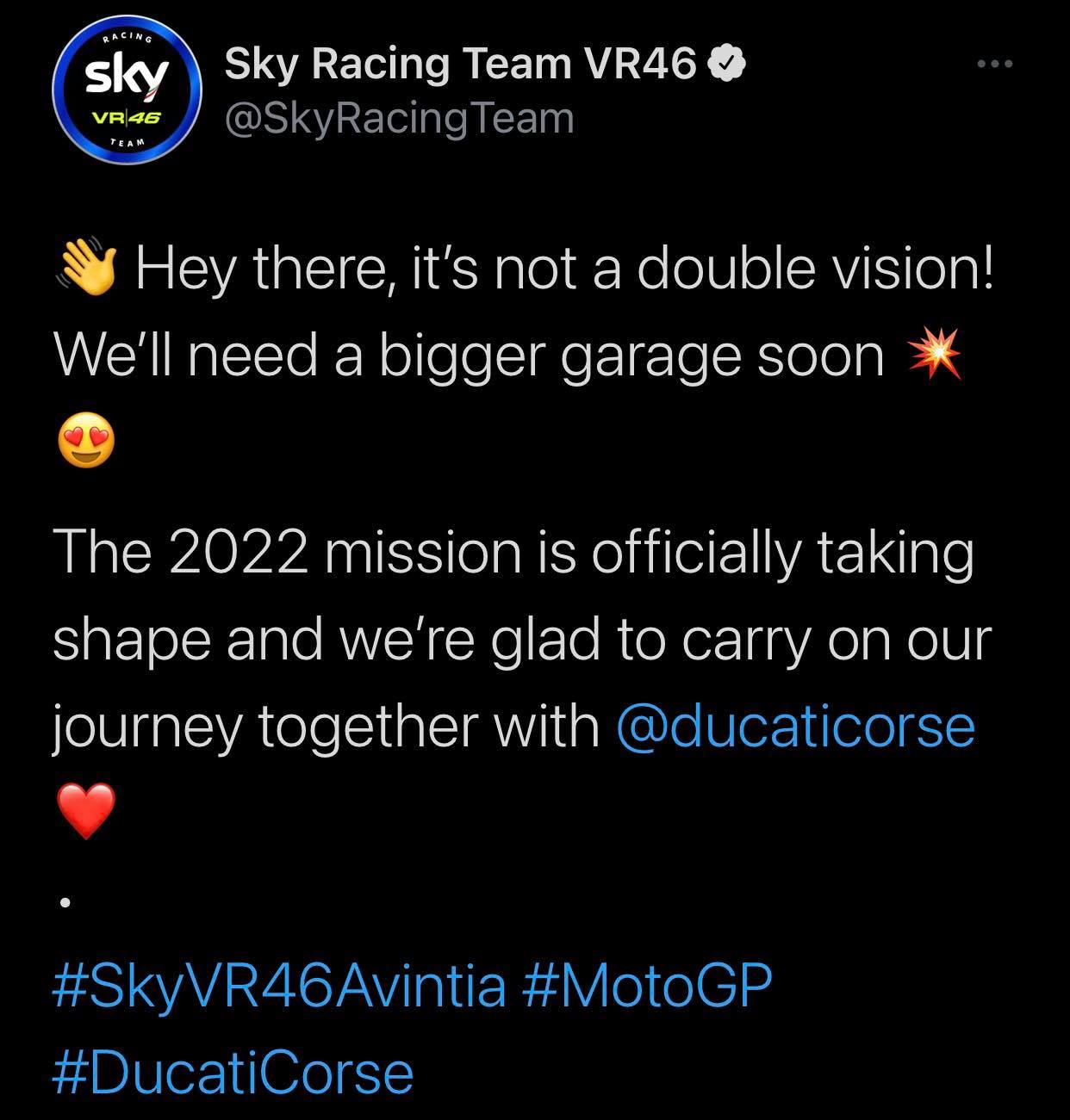 根據報導指出,VR46車隊與DUCATI簽下3年的合約,但目前仍不確定VR46車隊會拿到什麼版本的賽車,會與廠隊使用相同年份的新賽車,又或者是前一年的舊賽車;此外2022賽季也能確定DUCATI將會有8台賽車在場上奔馳,屆時將會出現紅色大軍迎戰對手的畫面。