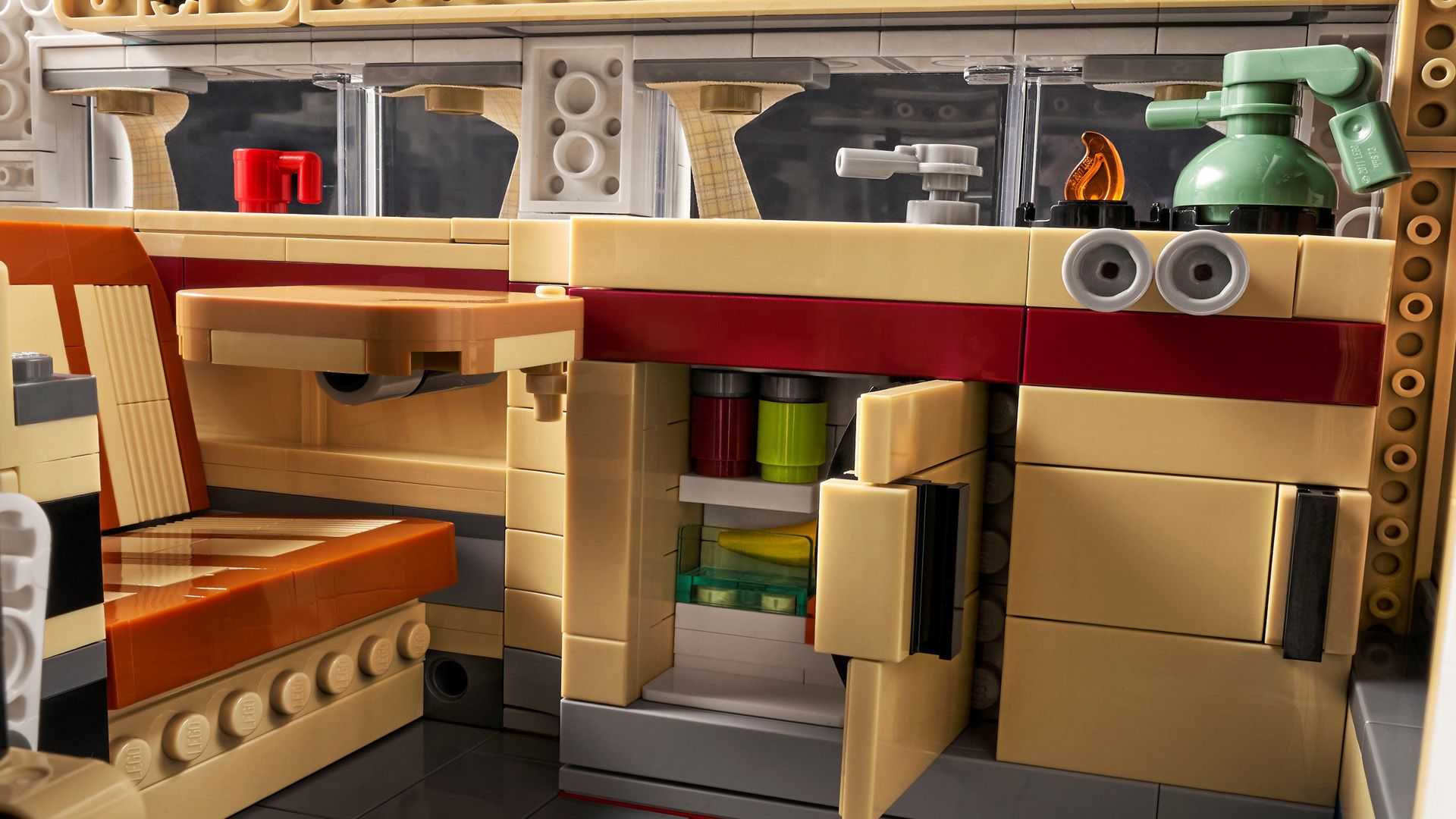 而除了上述的兩項特色之外,車內的細節呈現也相當到位,像是車輛當中的廚房該有的冰箱、水槽以及櫥櫃都相當齊全,甚至在櫥櫃內還有設計好要擺放什麼樣的物品,就連杯子也在車輛內可以找到,當然這是一輛車,所以前方的駕駛艙細節呈現也很重要,方向盤肯定是連動的前論,車輛正前方還有備胎的配置,完成呈現當年T2露營車的風采。