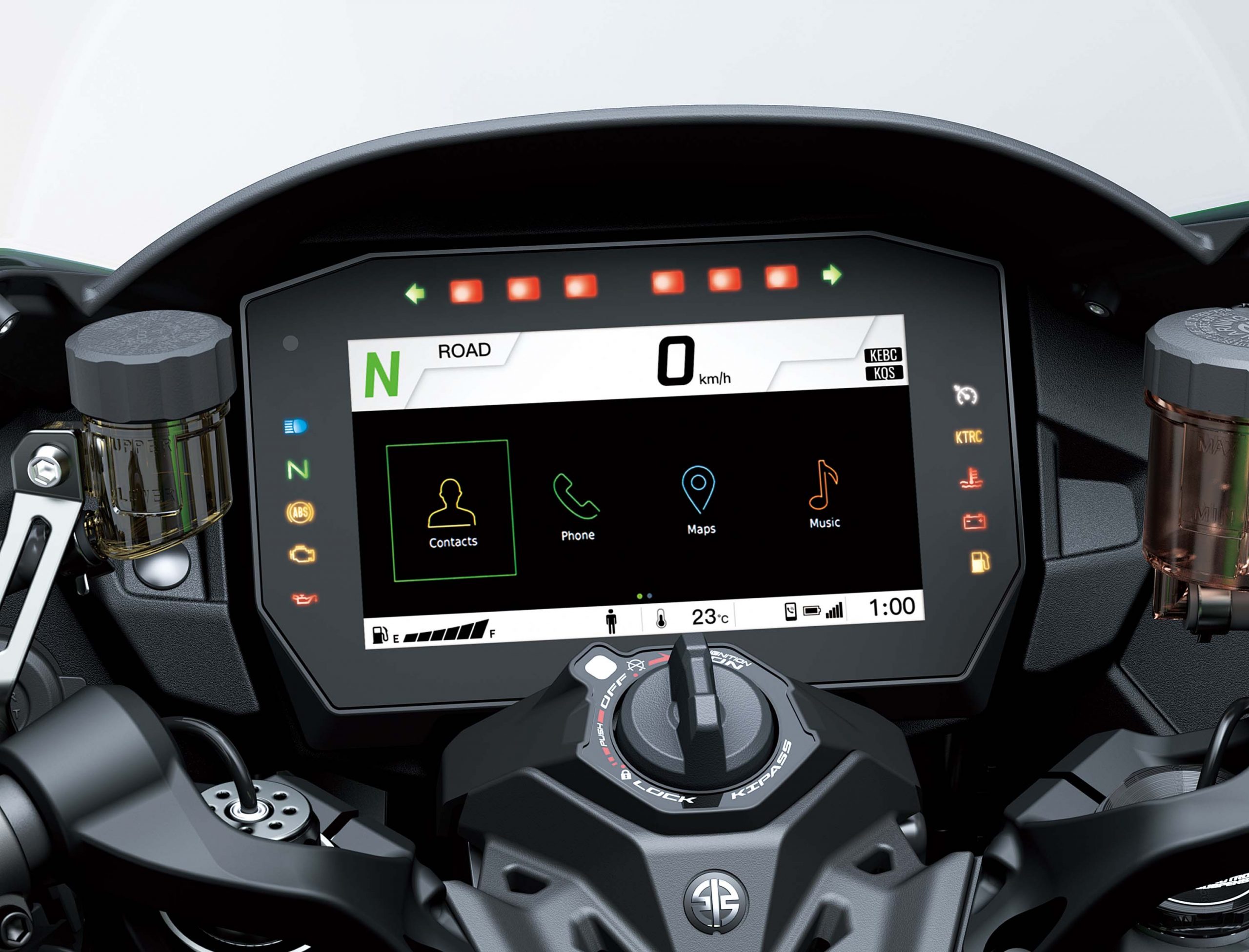 電控系統部分在原本就搭配了六軸IMU擁有KCMF過彎動態管理、KTRC循跡防滑、KLCM起步控制、KIBS智慧防鎖死煞車、KQS進退快排、KEBC引擎煞車調整、騎乘模式調整,另外在這次的H2 SX/SE當中也導入了前一代頂規才有的KECS電子懸吊控制系統,不論是阻尼或是預載都可以輕鬆調整,並且搭配BOSCH開發的APP「Kawasaki SPIN」與智慧型手機連動,透過手機就可以調整懸吊以及引擎動力的輸出表現,當然也可以從全新的6.5吋TFT全彩儀錶當中進行調整,展現出強大的科技水準。