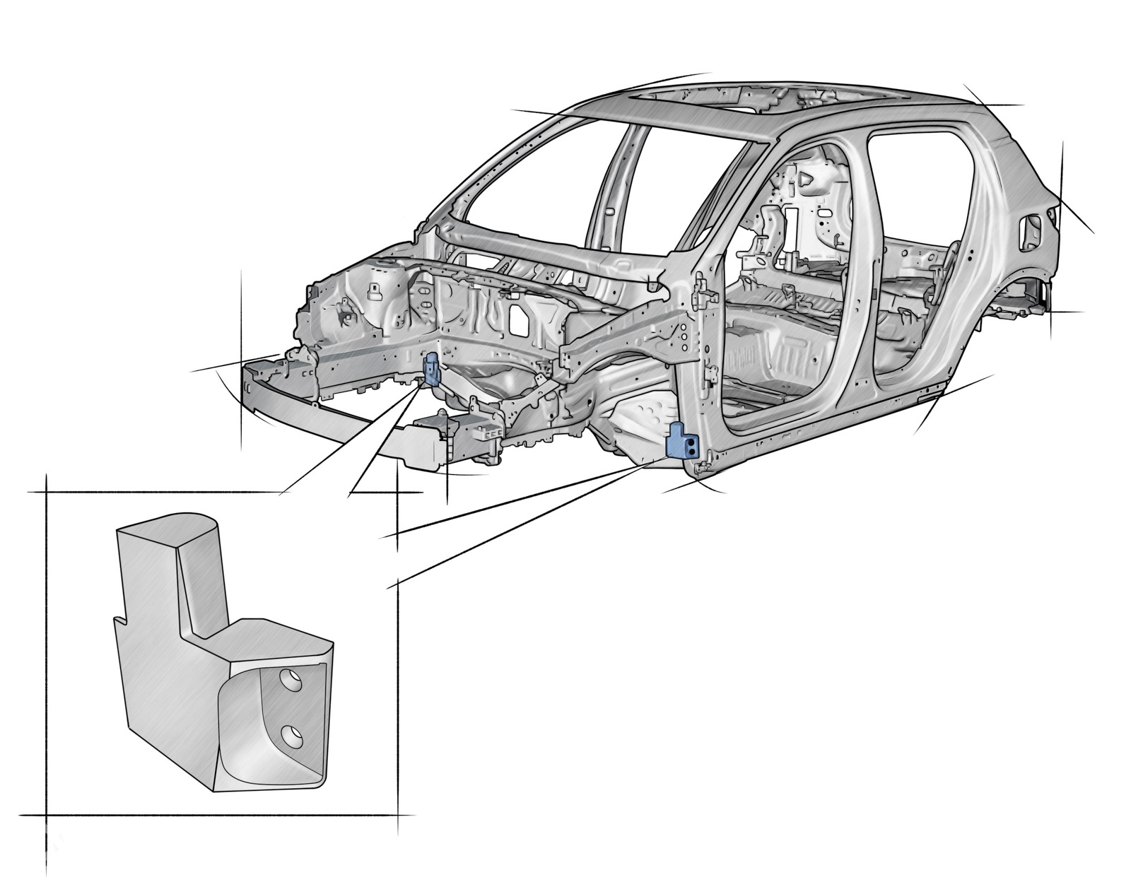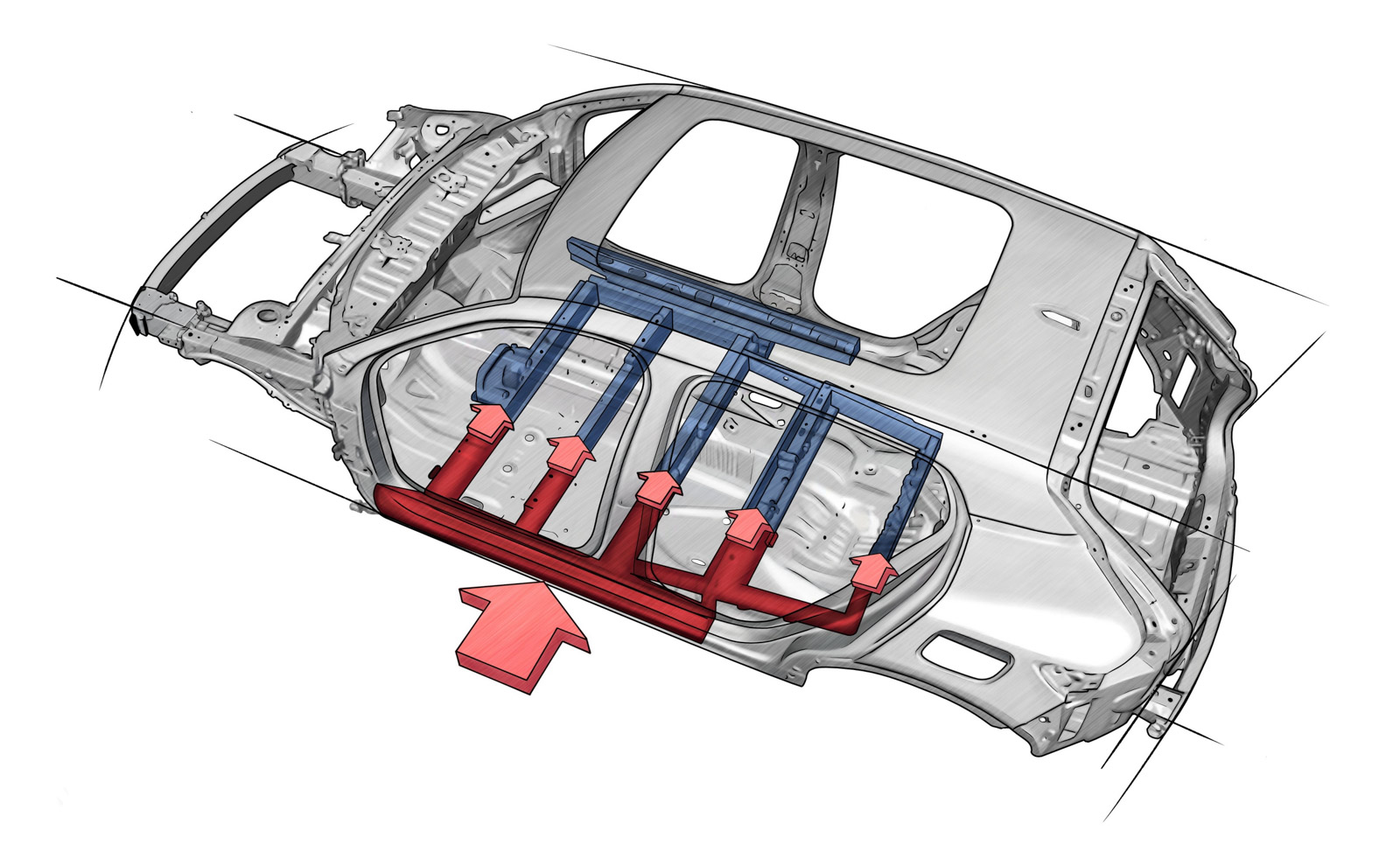 針對車體安全結構,專為電動車配置的 CMA 平台優化前方結構增加遇碰撞時的安全性,前方潰縮區亦強化下方防撞鋼樑確保車室完整性;兩側 A 柱下方靠近底板處設有鑄鋁滑塊,在小偏位撞擊情況下能帶動車輛向外偏滑藉以減少傷害;發生側面撞擊時,鋁擠型的堅實底樑與電池外框可確保側面結構穩定,同時傳導碰撞力量分散至車廂外,保護車室及高壓電瓶模組,在在顯示 CMA 平台的多元性,除了有別於其他油車平台改上電池馬達組之電動車,更是以電動車設計思維打造,為性能、效能、操控與安全等面向獲得完美平衡。