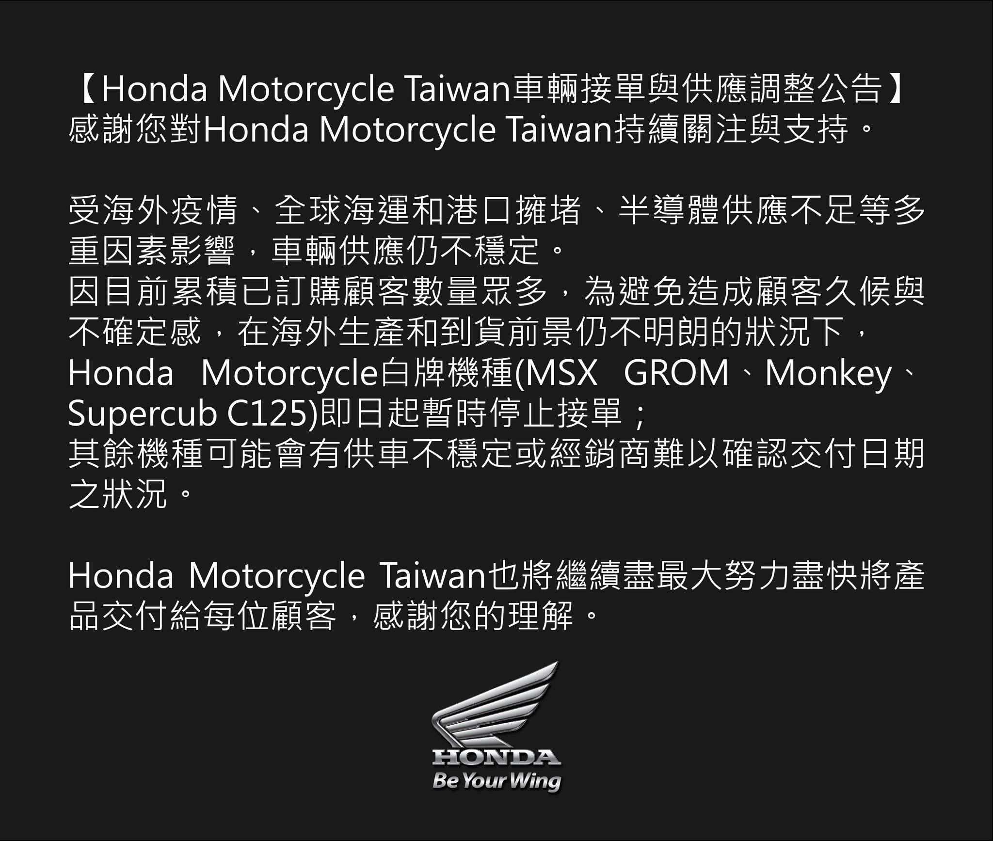 根據HONDA JAPAN發布的新聞稿,這次暫停接單的10款車型分別為Rebel 250、Rebel 500、Rebel 1100、CRF250 Rally、CRF250L、Forza、ADV150、Grom、Monkey 125和Hunter Cub;目前台灣本田有導入的車款有Monkey 125、Rebel 500、Rebel 1100以及Grom(MSX 125)。