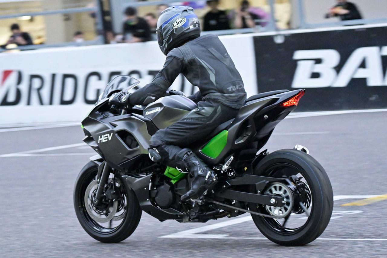 首先是大家最期待的油電混合動力忍者,先前在商業政策說明會上以裸露車架的方式亮相,這次則是裝上了車殼來進行賽道試乘,車頭大燈採用和NINJA 400同款的燈具設計,但側面的整流罩、側殼和尾殼都長得很不一樣,多了許多空力套件的點綴,推測應該是為了讓安置在坐墊下方的大型電池模組進行散熱。