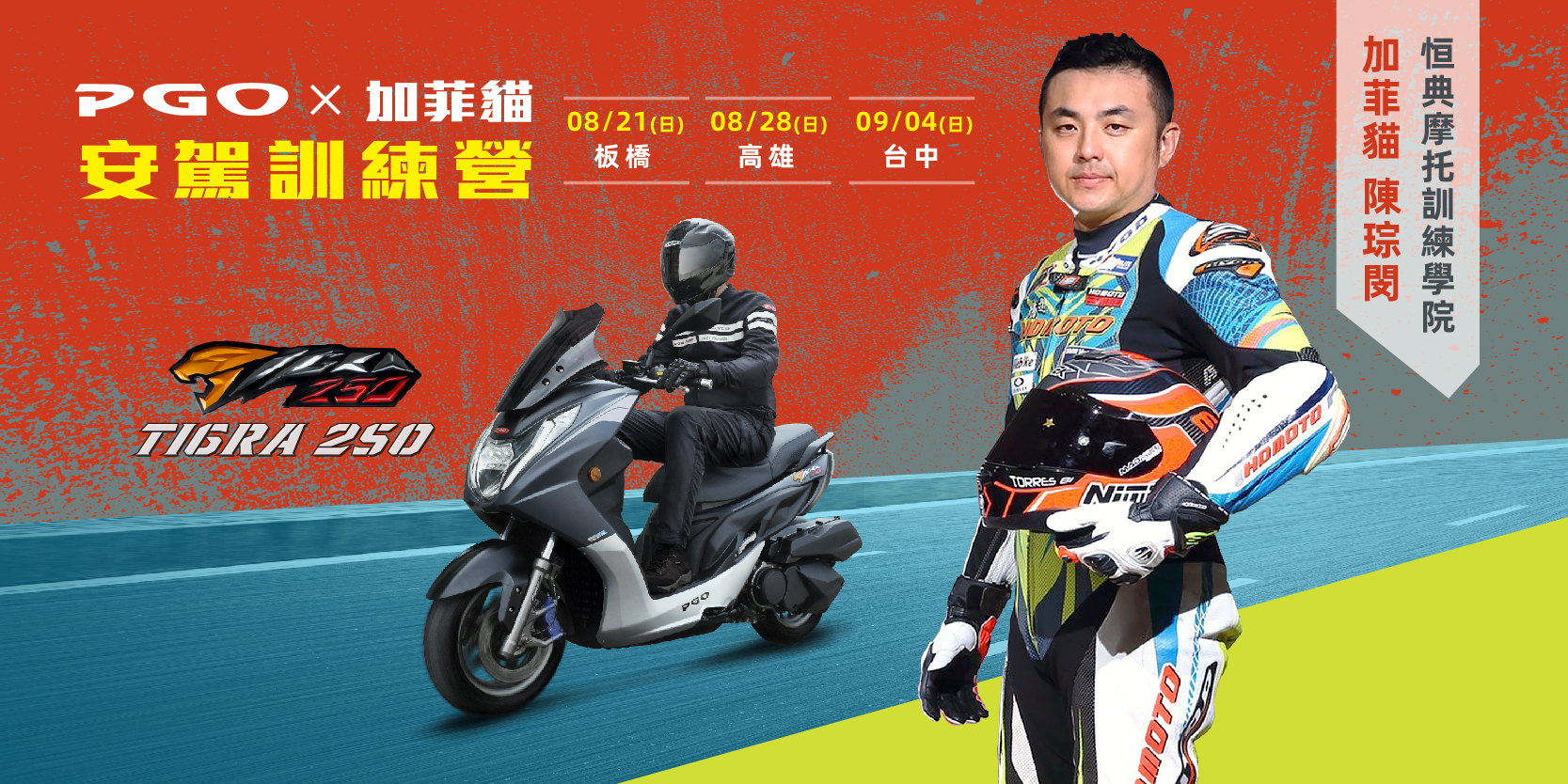 具白牌靈巧、黃牌路權的 PGO TIGRA 250 擁有小軸距大動力。在 07/13 上市以來短短半個月預購量已超過 300 台,除了全台通路提供已有「大型重型機車駕照」的消費者試乘外,PGO 將於 08/21(日) 板橋;08/28(日) 高雄;09/04(日) 台中,與致力於二輪安駕推廣的恒典摩托訓練學院 合作,由總教練-陳琮閔(加菲貓)帶領專業教練團,打造專屬 PGO TIGRA 250 的重機安駕訓練營。