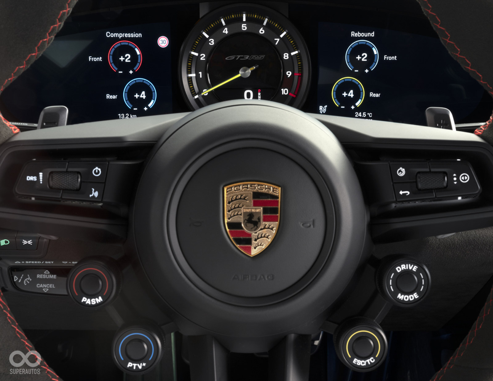 全新911 GT3 RS提供三種駕駛模式:Normal / Sport / Track,在Track模式下每項設定皆可獨立調整,其餘兩種模式則可針對前、後懸吊的回彈及阻尼進行多段的獨立調整,後差速器也可透過方向盤上的旋鈕進行調整,另外控制可變尾翼功能(DRS)的四組旋鈕與按鍵皆設置於方向盤上,這些快速且直覺的操作與訊息顯示概念同樣源自於賽車運動。這些旋鈕在調整的過程中以圖像化的方式顯示在駕駛儀表上,全新911 GT3 RS同樣具備與911 GT3類似的賽道顯示模式,只需按下按鍵便會減少不必要的訊息僅保留基本資訊,在螢幕左側的檔位顯示及右側的類比轉速表設計同樣延續911 GT3的賽車風格。