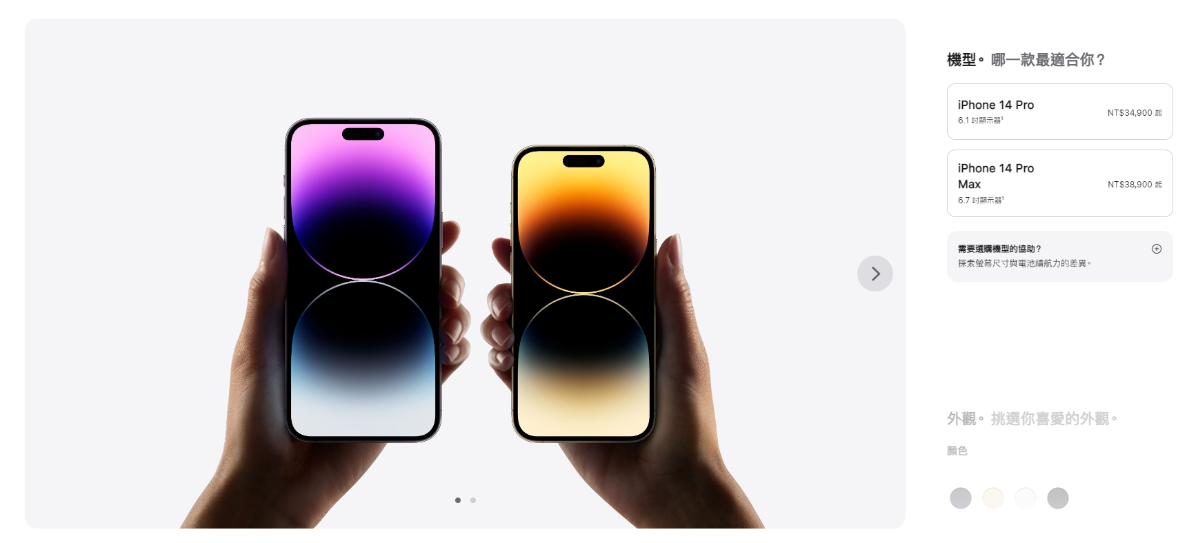iPhone 14 Pro/Pro Max推出四種顏色,分別為深紫色、銀色、太空灰色和金色,iPhone 14 Pro售價從34,900元起、iPhone 14 Pro Max售價從38,900元起;iPhone 14 Pro/Pro Max將從9月9日晚上8點開始預訂,9月16日開始發售。