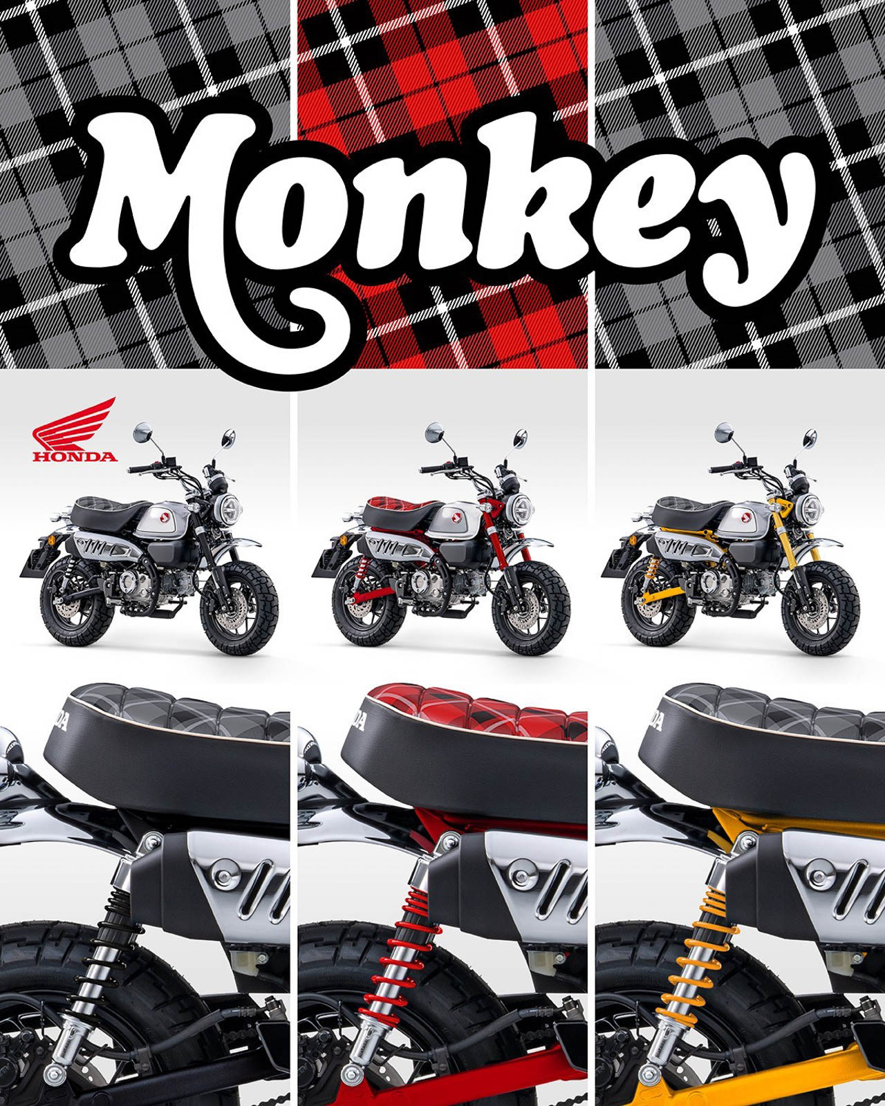 最有趣的地方在於坐墊,HONDA改掉過去經典的毛毛蟲坐墊設計,改以花呢格紋(蘇格蘭格紋)呈現,特別是紅色塗裝版的坐墊,看起來真的有濃濃的蘇格蘭風情;HONDA也表示,2023年式的MONKEY 125新塗裝是致敬60年代的MONKEY塗裝風格,不得不說,這次的新車色塗裝,真的讓人感受到MONKEY 125滿滿的玩味性質。