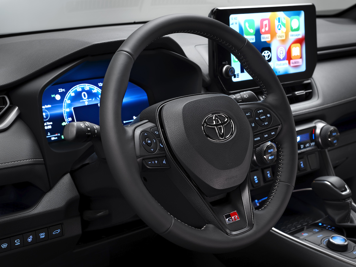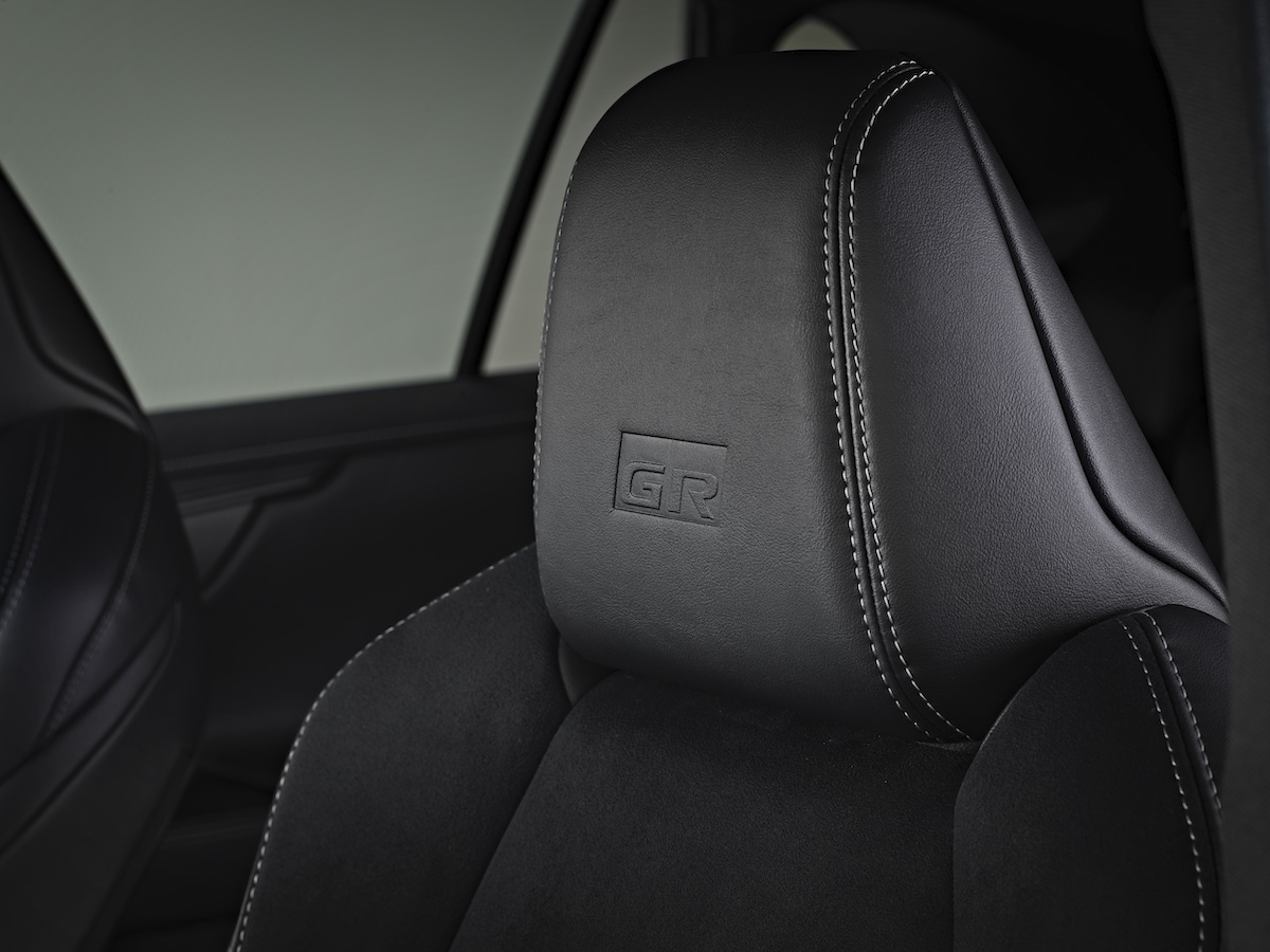內裝方面,雙前座椅換成了兩張運動化座椅,椅面中間採用麂皮絨面搭配兩側合成皮革,除了提升視覺質感,也能在激烈操駕時起到止滑的作用,頭枕也印上了 GR 字樣的壓花,並擁有雙前座電動調節、駕駛座椅記憶功能,三幅式方向盤下方則有熱血的黑紅 GR 徽飾,採用 12.3 吋數位儀表,全新的10.5吋影音主機啟動時,則有車型專屬的 Toyota GR 開機畫面,並配有360°環景影像系統。除此之外,隨著歐規23年式的產品更新,ADAS 車輛輔助系統也獲得提升,新增了緊急轉向輔助系統與AEB交叉路口偵測系統。
