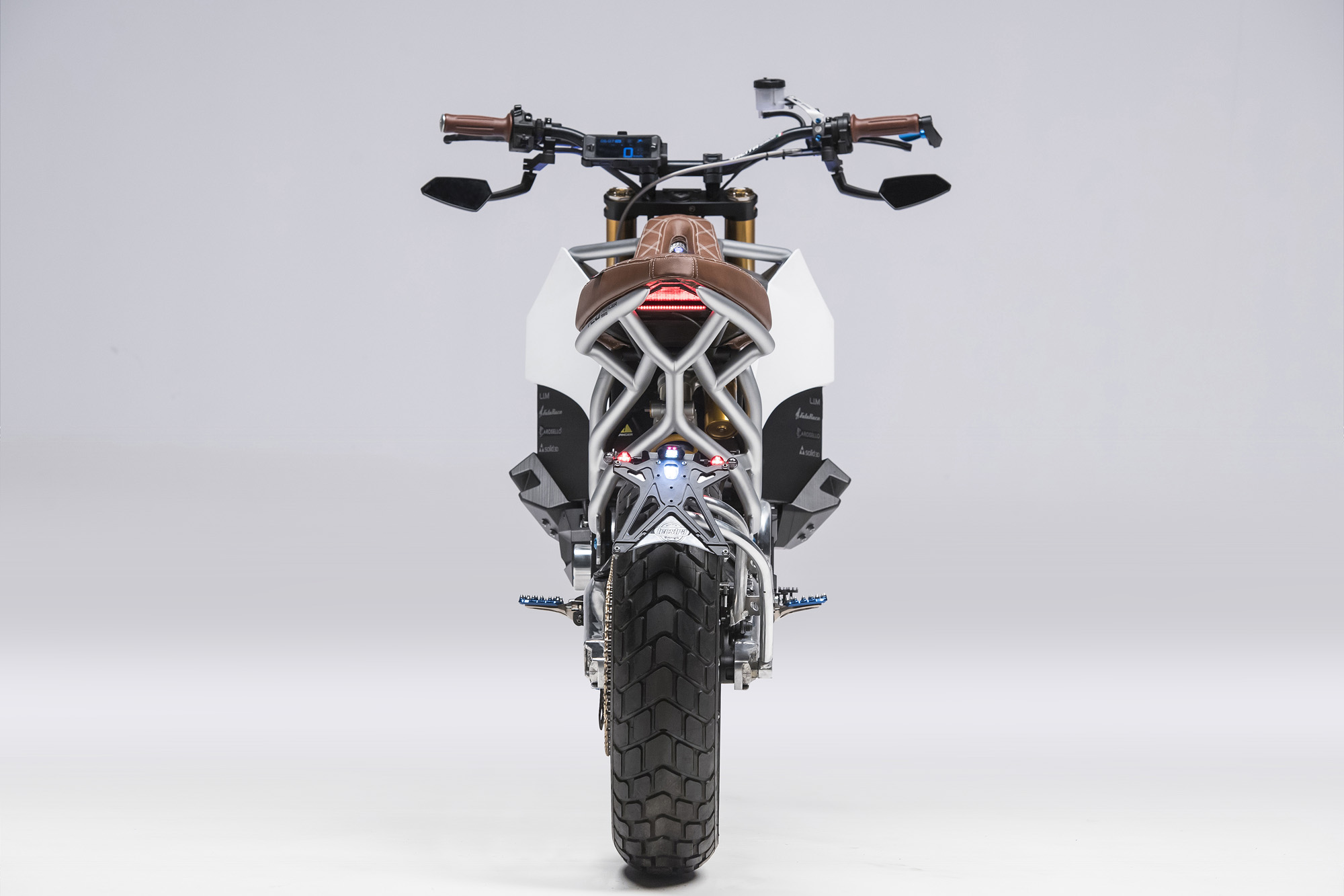 一輛車的美不單只是外型的線條,細節上的巧思更是令人玩味,Aero E-Racer就是這樣一輛值得品味的車。外觀乍看之下很有越野車的陽剛氣息,粗壯的48mm倒立式Ohlins TTX加壓氮氣前叉,搭配19吋鋼絲輪框,讓人感受到強烈的戰鬥感;車體外殼採單件式碳纖維製作,倒V字型的飛鏢造型,在簡單的設計下點綴出越野車該有的粗獷風格,隨著車殼的線條延伸至鋁合金後搖臂,搖臂的中間置入金黃色的Ohlins單鎗避震器,整體來看霸氣十足卻又帶著科技的內斂。