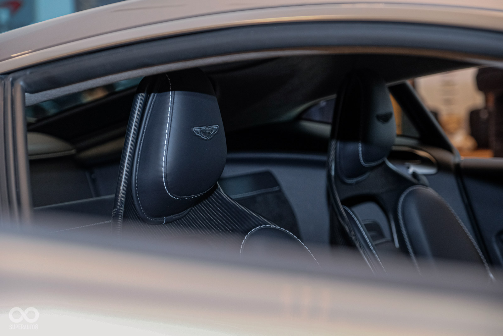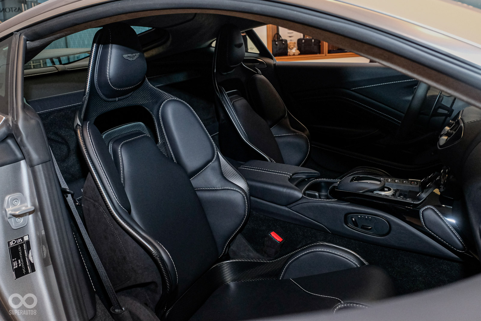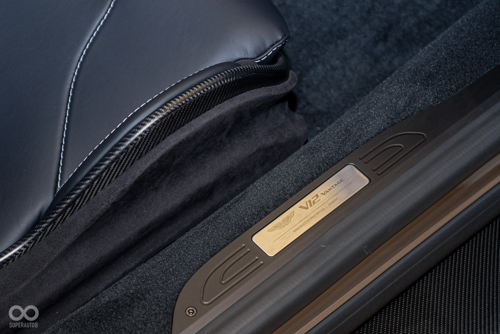 內裝方面,V12 Vantage 保留Vantage車款的經典樣貌標配頂級真皮的 Sports Plus 座椅,並鑲有品牌飛翼徽飾與網孔造型。車主亦可選配全新碳纖維高性能跑車座椅,配備六向調節功能,提供更佳的座椅支撐性。此款跑車座椅為Aston Martin受賽車運動啟發而打造的專利之作,在不影響乘坐舒適性的前提下,可減輕 7.3 公斤座椅重量。