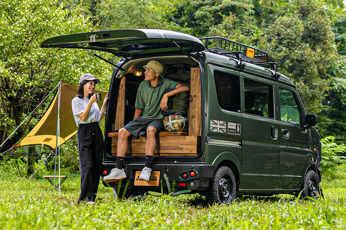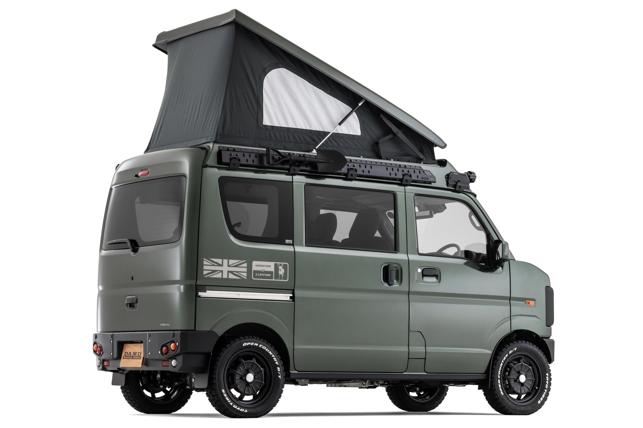 而為了展示小型廂型車的靈活的機能變化和越野潛力,DAMD 還打造了一個特殊版的 little D. 示範車,為他裝上了許多額外的越野與露營車配備。包括車頂上非常有質感的木製遮陽板、一對 PIAA 的探照燈,車側左邊上方配有一組車邊帳、右邊則有一組軍功風格的多功能置物架,可懸掛鏟子、吊掛衣物、或者延伸成另一面車邊帳,而車頂也改裝成了可上掀的車頂帳,車輪則換成了復古的8幅式鋁圈,搭配Toyo Open Country R/T 巧克力胎。
