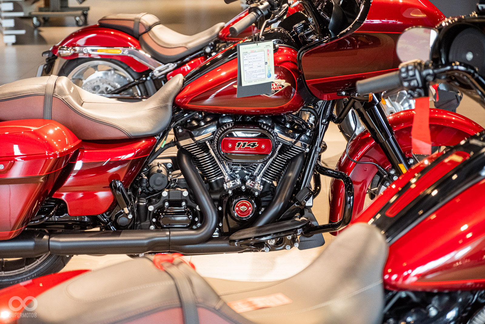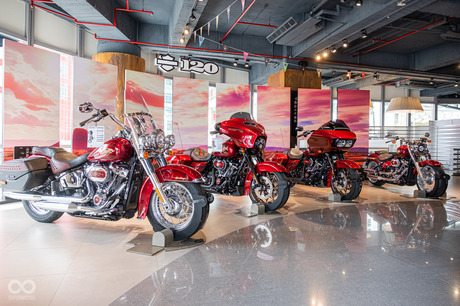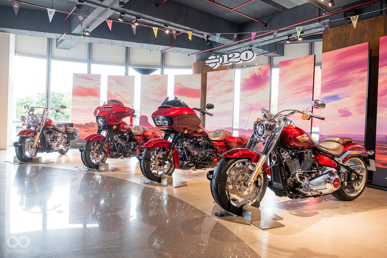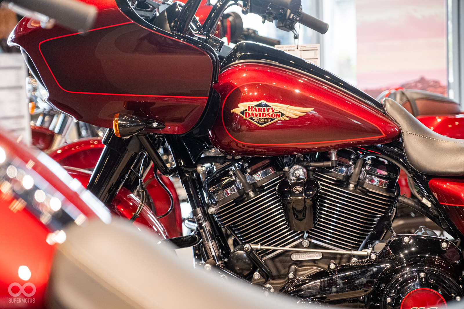 Harley-Davidson以6種車款打造120週年紀念款,包含:CVOTM Road GlideTM Limited、Ultra Limited、Street GlideTM Special、Road GlideTM Special、Fat BoyTM 114、以及Heritage Classic。在每個120週年紀念車款上,外觀烤漆以傳家紀念紅(Heirloom Red)作為主體顏色,同時在面板上勾勒鮮豔的紅色細紋,並混搭較深的暗夜緋紅(Midnight Crimson)色調。