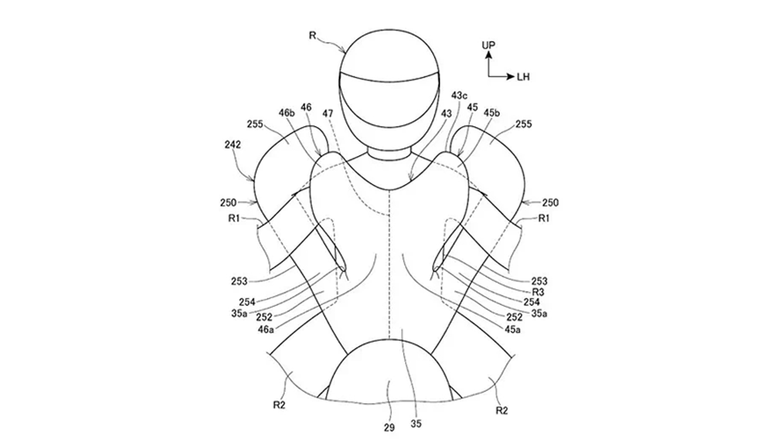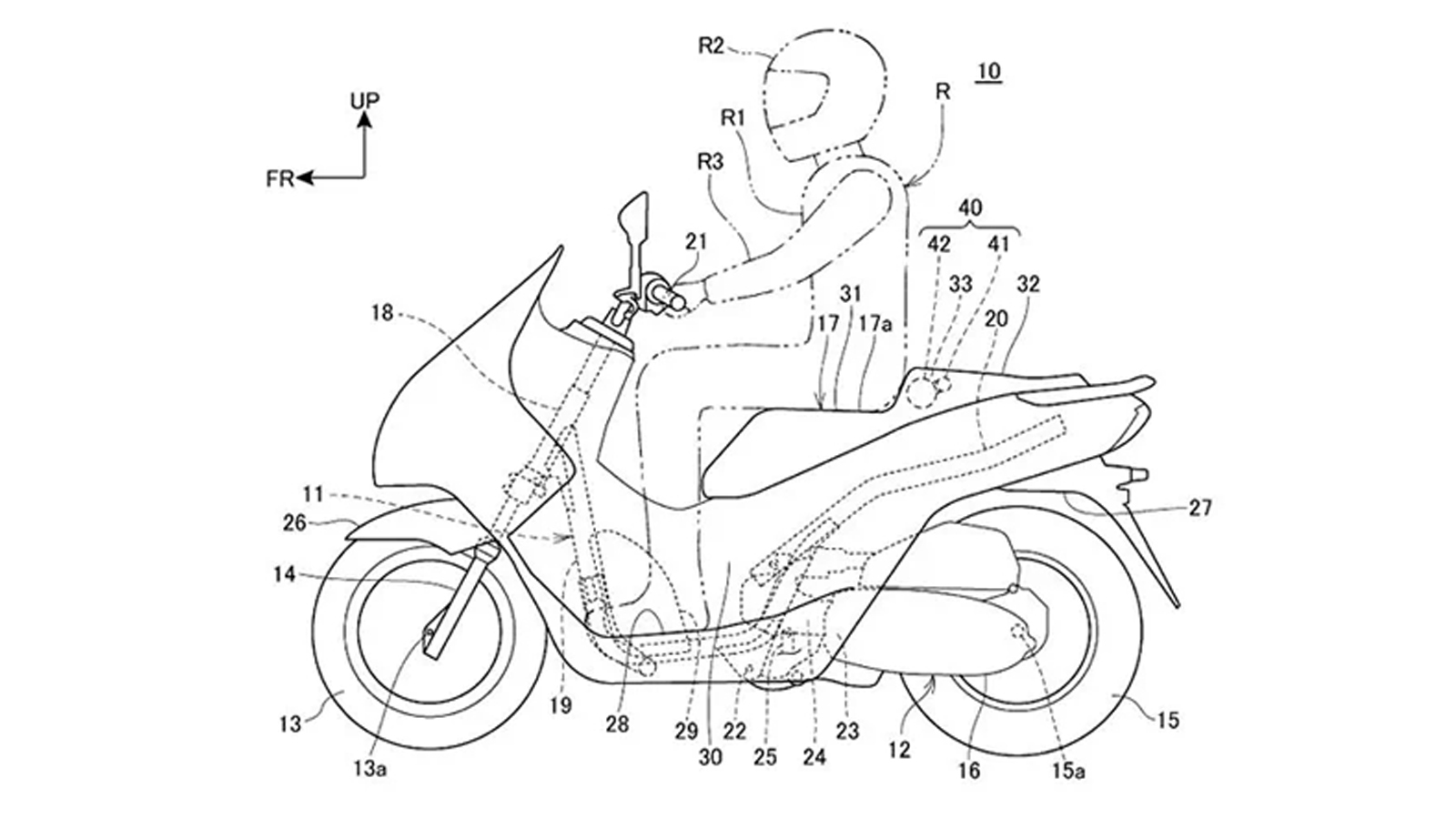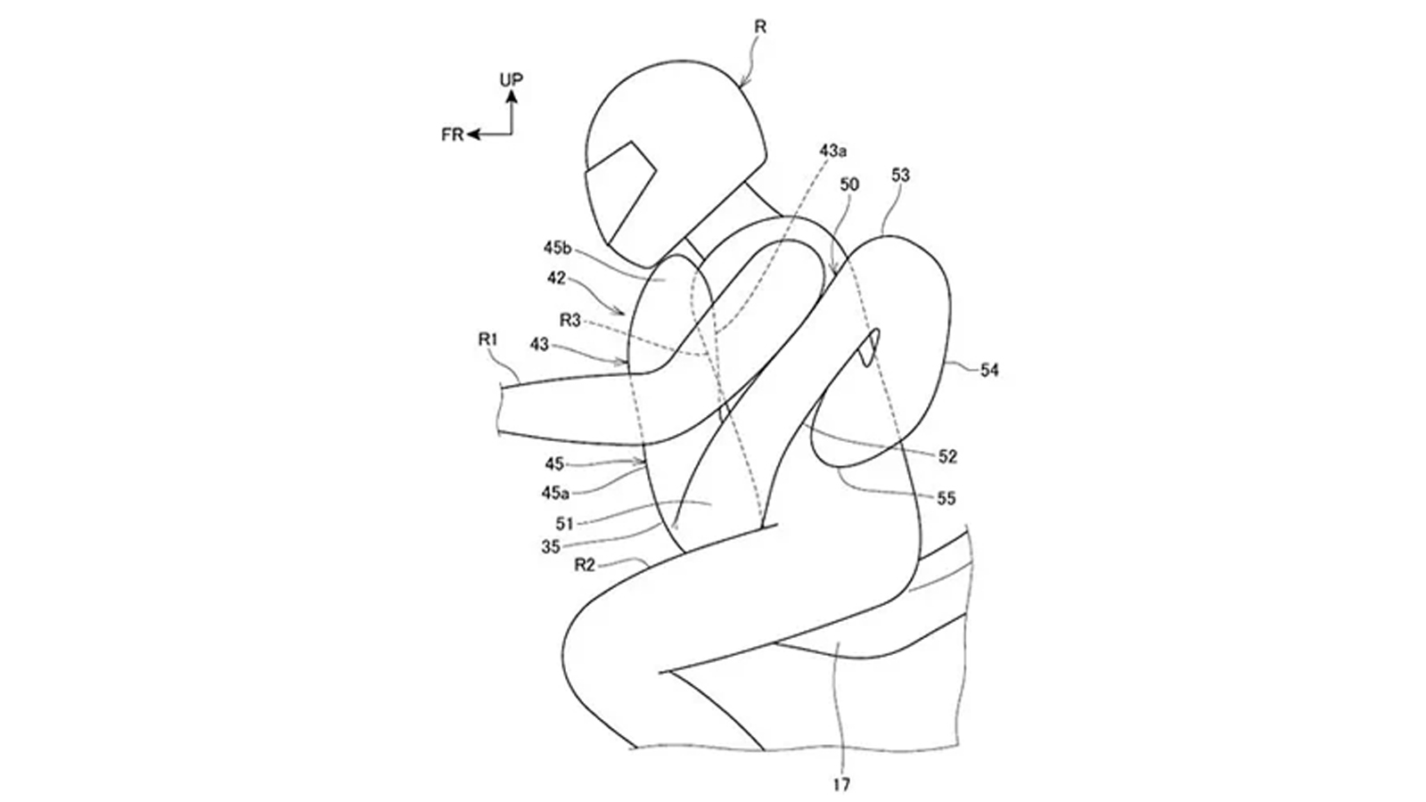 而近期由本田提出的大量專利申請中,可看出他們針對摩托車前置式安全氣囊的問題、結合人身安全氣囊部品的優點,構思出了一些解決方案,這些新專利主要的概念,就是將車載安全氣囊改為隱藏在車輛的座椅中,當發生碰撞時,氣囊將充氣並包裹在騎士的身上,並且氣囊在彈出後可立刻與車輛分離,就如彈射座椅一般,讓騎士就算因慣性不幸被拋飛時,仍可獲得氣囊的保護並減緩撞擊力道。