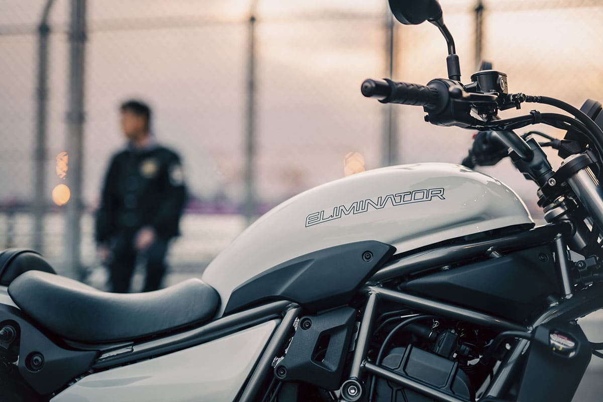 Eliminator的輪圈採用前18後16吋的搭配;Eliminator的坐墊使用美式風格的三角形單做設定,但在後座部分直接收窄成細長的小坐墊,雖然舒適度表現可能不太好,但坐墊線條的收束配上長條狀的尾燈、長尾殼設計,給人一種俐落的戰鬥感;高階的Eliminator SE車型則是在車頭加入小風鏡的設計。