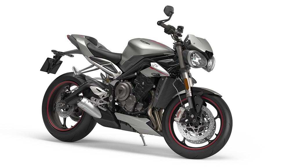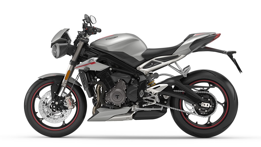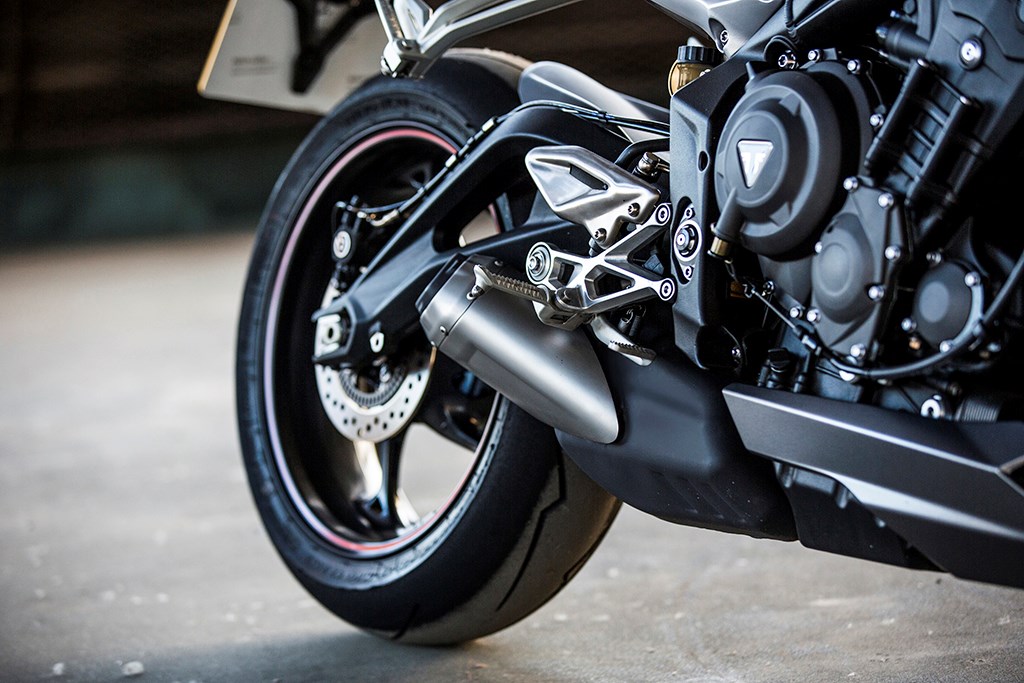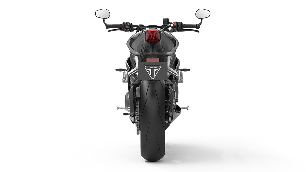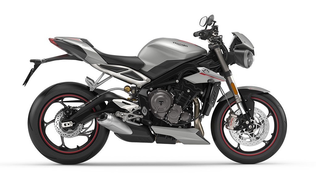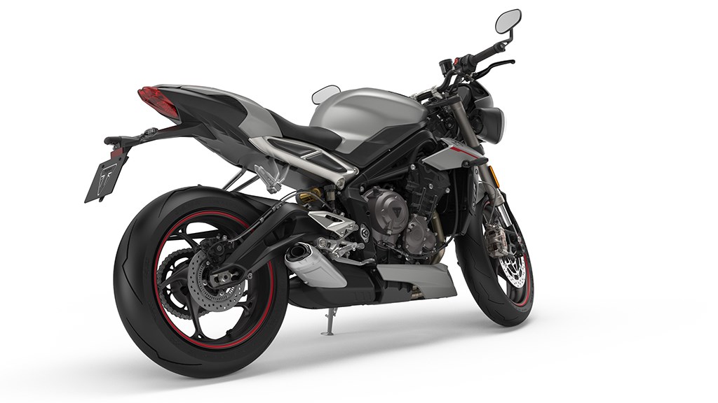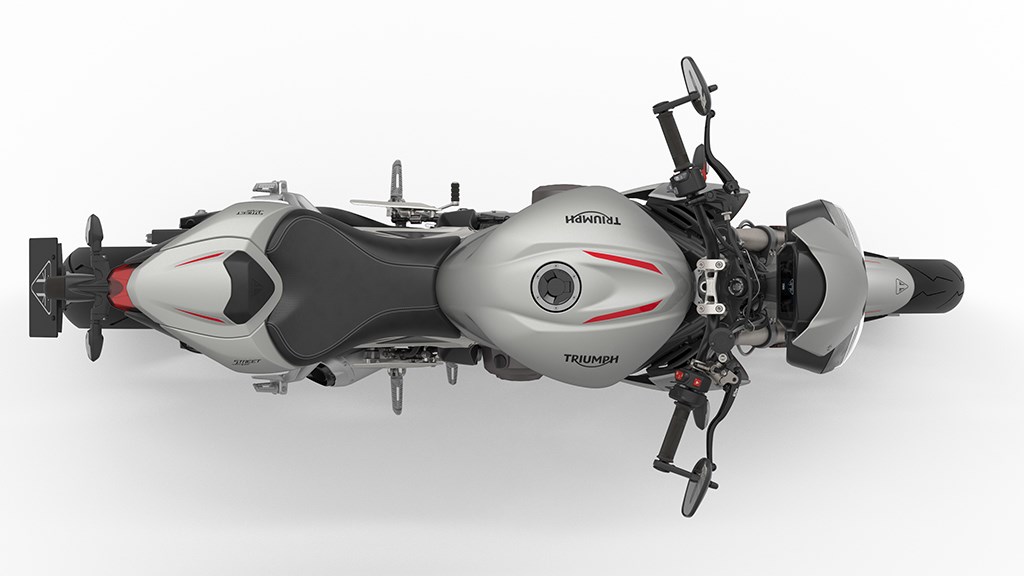 Street Triple在運動街車中的外型本來就獨樹一格,宛如跑車的車體,搭配上與老大哥Speed Triple相同圓滑洗煉的雙大燈設計,至今已經成為家族的強烈形象。在燈具上,日行燈升級為LED,比傳統燈泡亮度提昇28倍。外型另一個獨特之處在於照後鏡設置在把手末端,與Speed Triple相同採用牛角鏡設計,帶出品牌英式復古的基調,換上單座蓋,裝上下整流罩,讓身為街車的Street Triple映照出了跑車般的倒影。
