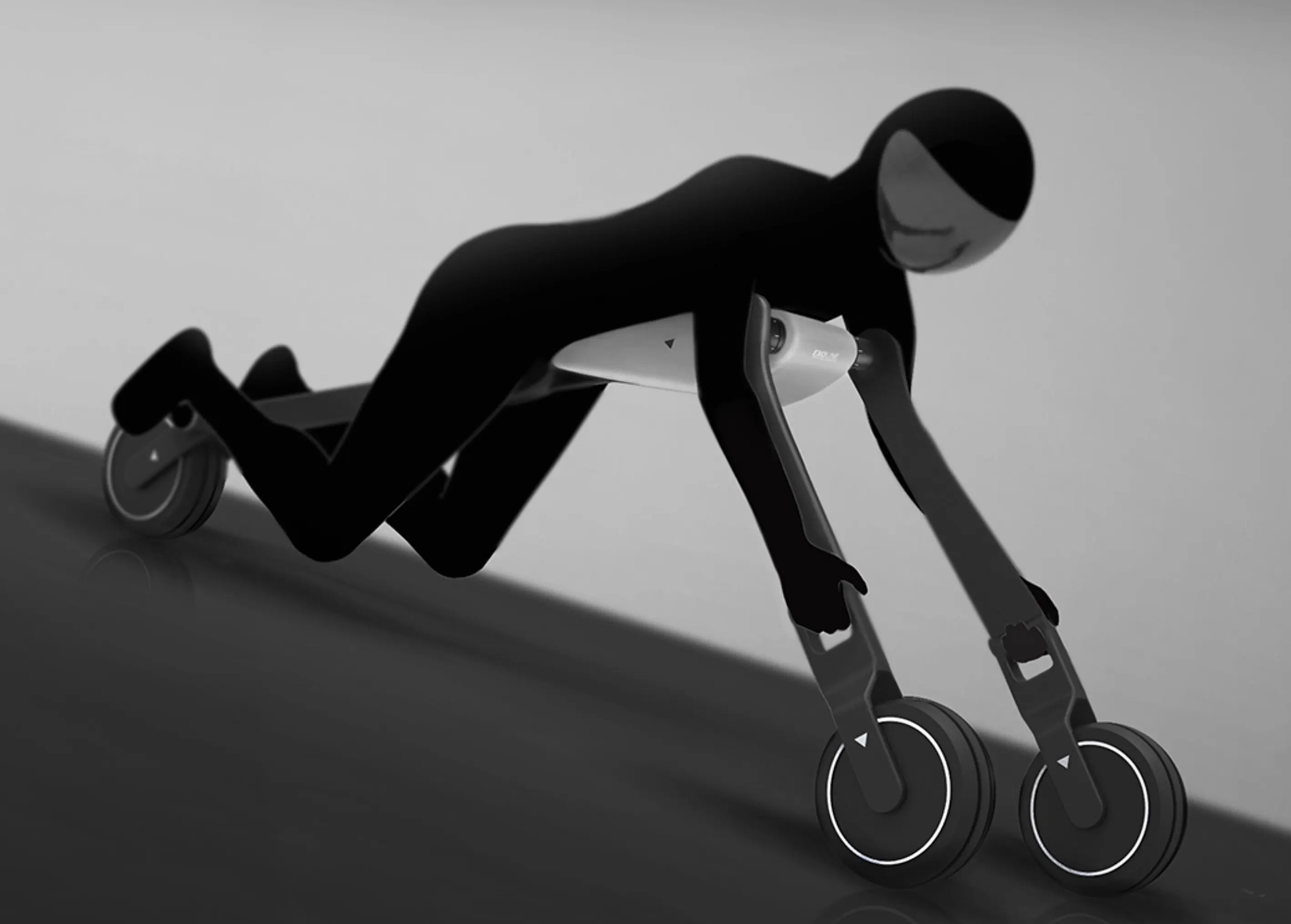 要騎乘 Exo-Line,你需要把它展開並穿戴在胸部,讓頭部朝前,你的腳放在後輪旁邊的兩個小踏板上,手臂向前移動以抓住兩個前輪支架,然後你就可以用一個常規搖杆來控制方向、加速和剎車,設計師稱,這種方式可以讓你“透過身體運動,來改變車輛前進的方向”。