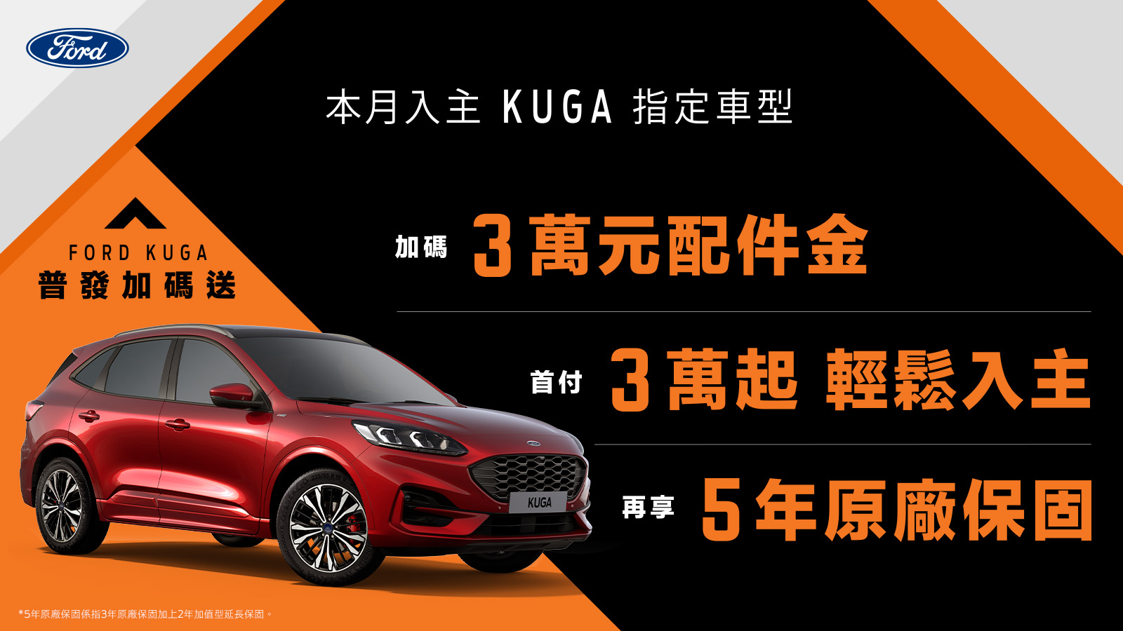 為回饋台灣消費者的持續肯定與支持,福特六和率先響應政府普發6,000元現金政策,在春遊好時光由「純正運動跑旅」New Ford Kuga全力助攻,推出「普發加碼送」購車優惠,自2023年4月1日至4月28日止,消費者入主New Ford Kuga指定車型(超質X/旗艦/旗艦X/ST-LineX),即可享3萬元配件金、首付3萬元起及5年原廠保固 等限時優惠大禮,讓消費者低首付輕鬆坐擁「純正歐系運動跑旅」。「純正運動跑旅」New Ford Kuga以1.5L及2.0L渦輪汽油引擎雙動力策略,搭配多款不同風格外觀,以及豐富大滿配的先進安全與智慧科技,展現多元的產品編成與強勢競爭力。