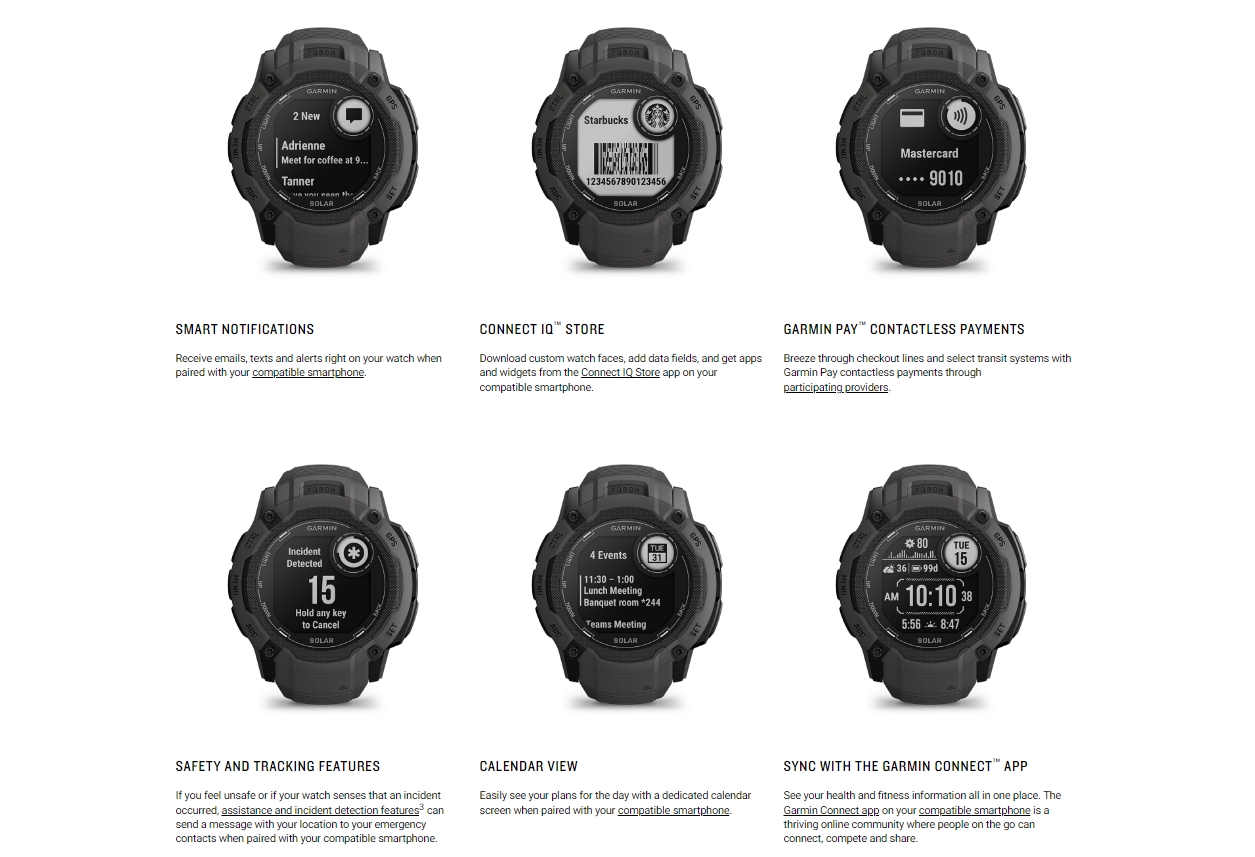 此外,它還可以與相容的智慧型手機配對,接收電子郵件、簡訊和提醒通知,支援 Garmin Pay 行動支付,並提供全方位的健康監測功能,例如心率、壓力、睡眠、血氧等。它還有超過 30 種運動模式,包括跑步、自行車、游泳、肌力訓練、室內攀岩、虛擬跑步、高爾夫球、瑜珈、皮拉提斯等等。