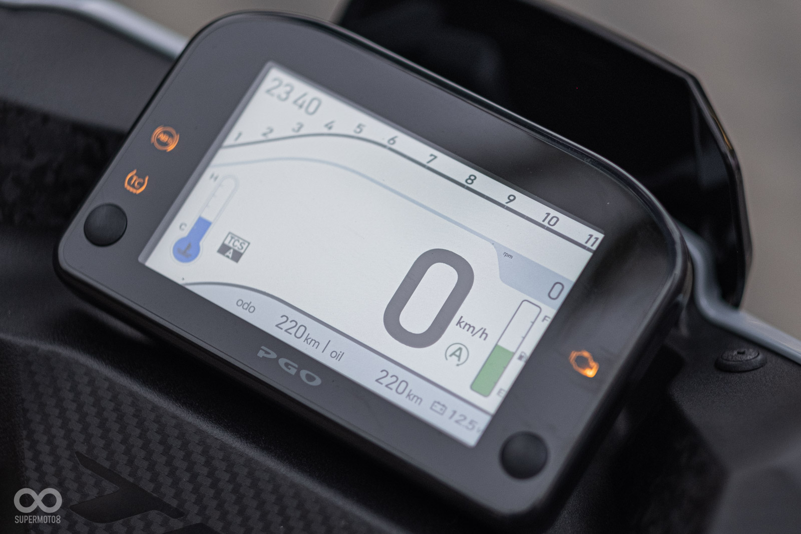 除了驚人的馬力重量比之外,PGO TIG另一大亮點就是直接導入德國BOSCH的電控系統,除了具備ABS、TCS之外,在TCS部分還有SPORT/NORMAL/OFF的三段可調;儀表採用5吋TFT顯示,還支援角度可調功能,並可額外選配盲點顯示(需選配行車記錄器)、胎壓偵測(選配)功能,儀表介面也全數中文化,可透過儀表兩側按鈕操作,進入設定頁面後,下方還貼心顯示操作說明。