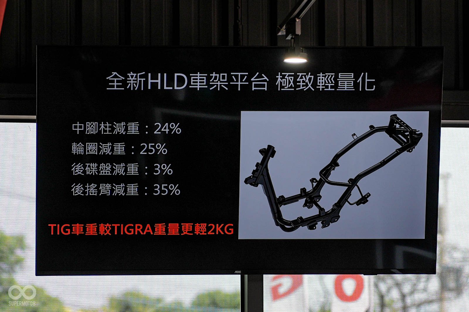 車架方面,PGO TIG這次也特別針對車架減重和強化,縱向剛性提升35%、扭轉剛性提升26%;減重部分,中柱減重24%、輪圈減重25%、後碟盤減重3%、後搖臂減重35%,與TIGRA 150相比,TIG也輕了2公斤;此外,PGO TIG在軸距方面也是同級車中最短,僅有1295MM,讓TIG擁有相當好的靈活度。