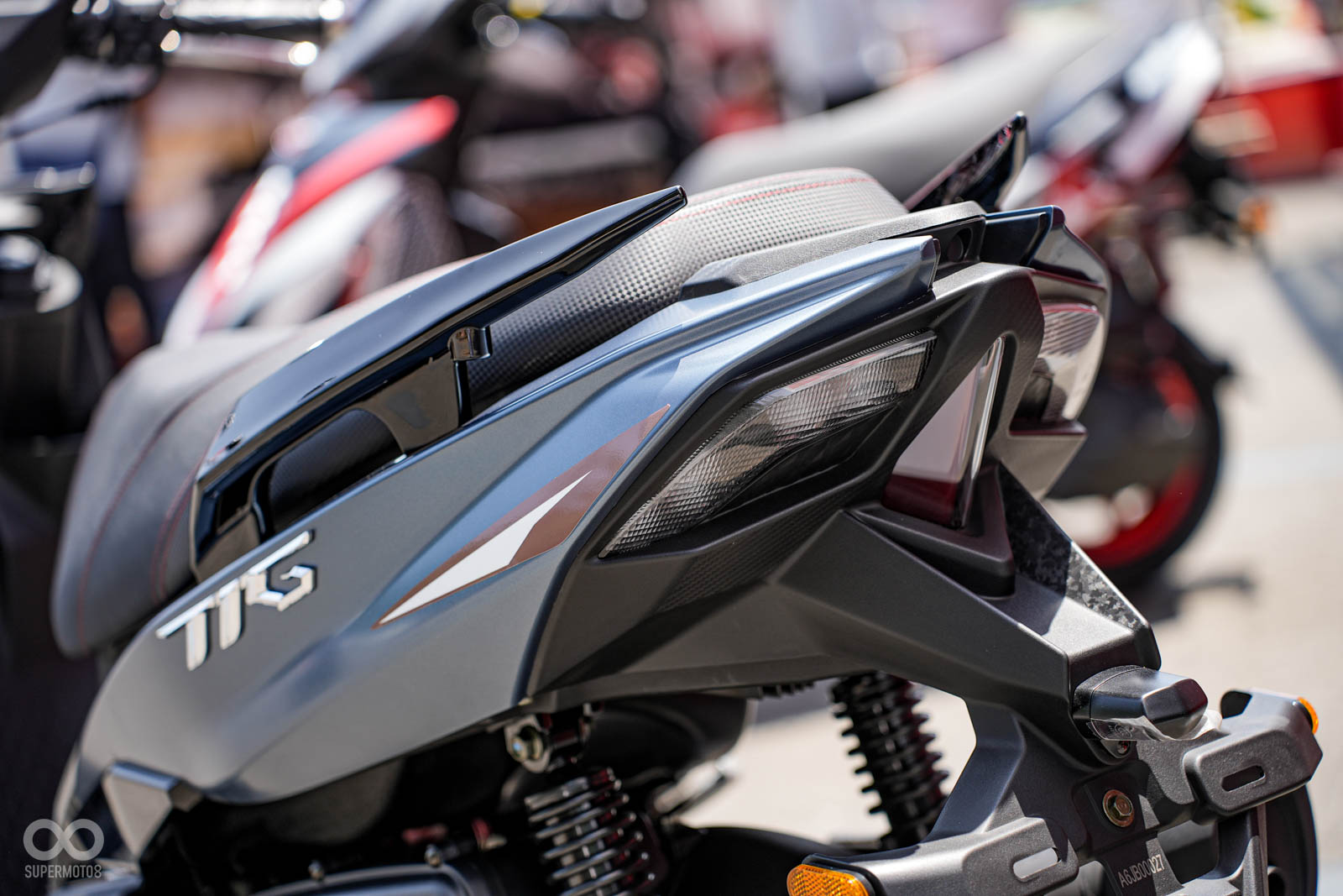 來到側面,PGO也在TIG的前半側殼上加入蜂窩狀的散熱網點綴,車身上更加入不少碳纖維紋路,甚至有鍛造碳纖維的裝飾,車身側面的線條相比於車頭正面則是略為收斂一些,坐墊下方側殼上有TIG的立體字樣;尾燈、方向燈使用T字型一體化設計,在沈穩之中依舊飄散著一絲戰鬥氣息。