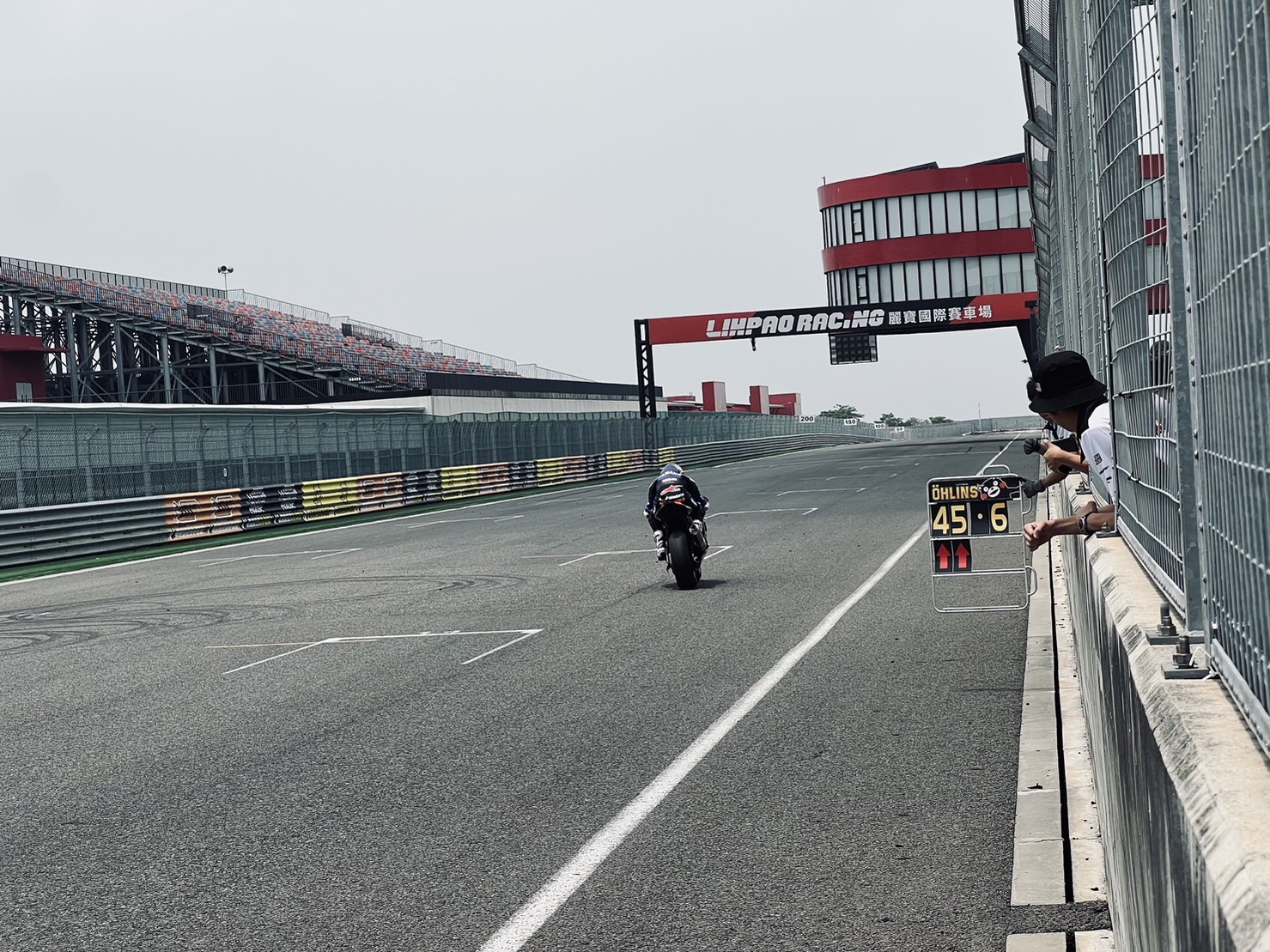 今日(5/26)Mike Jones則是來到麗寶國際賽車場挑戰先前由法國FSBK超級摩托車錦標賽現任年度冠軍車手Kenny Foray寫下的1分45秒428的最速紀錄,Mike Jones這次騎乘由aRacer艾銳斯提供、裝上了RC Super X全取代電腦的YAMAHA YZF-R1,並且同樣由泰山Ohlins、匠Moto二輪商社、PIRELLI光頭競賽胎等周邊廠商協助整備、調校車輛;Mike Jones最終成功以1分43秒768的成績,刷新麗寶國際賽車場的最速單圈紀錄。