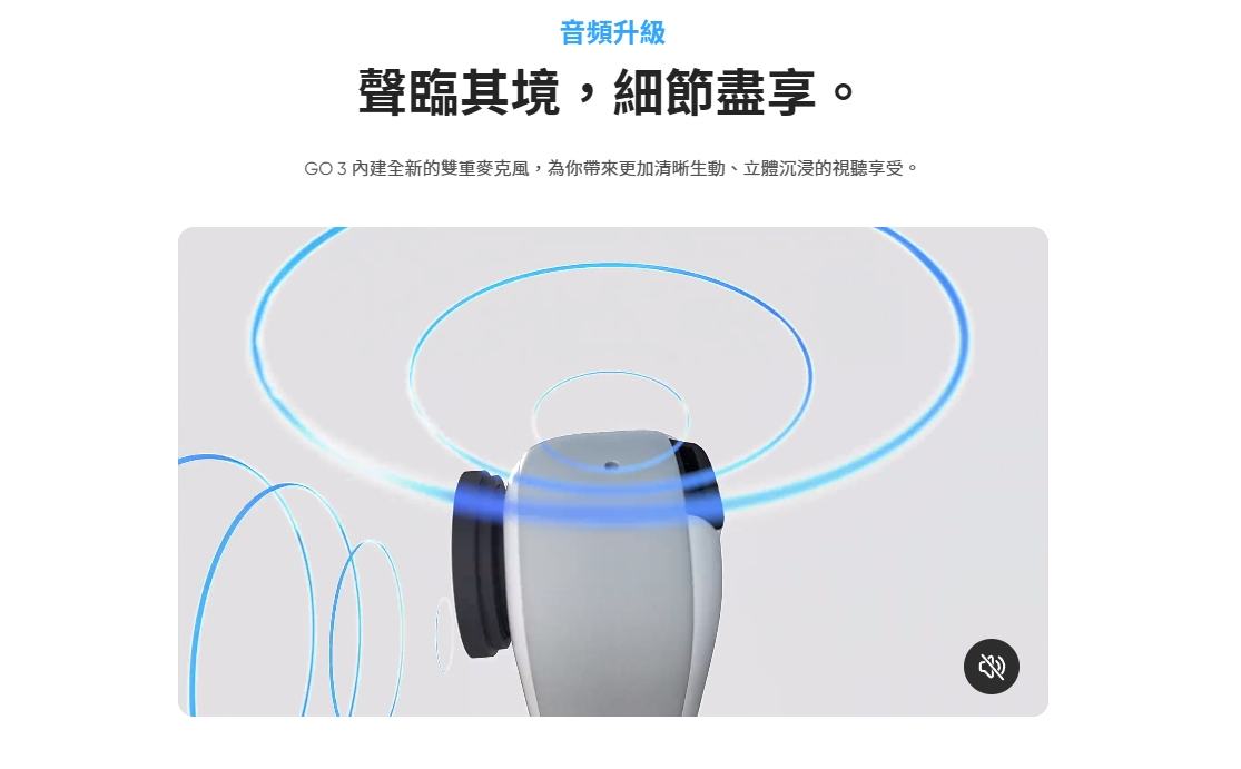 Go 3的錄影規格升級到了最高2.7K 30fps,同時內置了雙麥克風。相機本體具有IPX8防水功能,安裝Action Pod後整機達到IPX4防潑濺級別。在軟體方面,這款產品使用了Insta360的FlowState防手震算法,支援全景水平校正、AI剪輯和多比例匯出,還有縮時、慢動作、HDR等常見的拍攝功能。