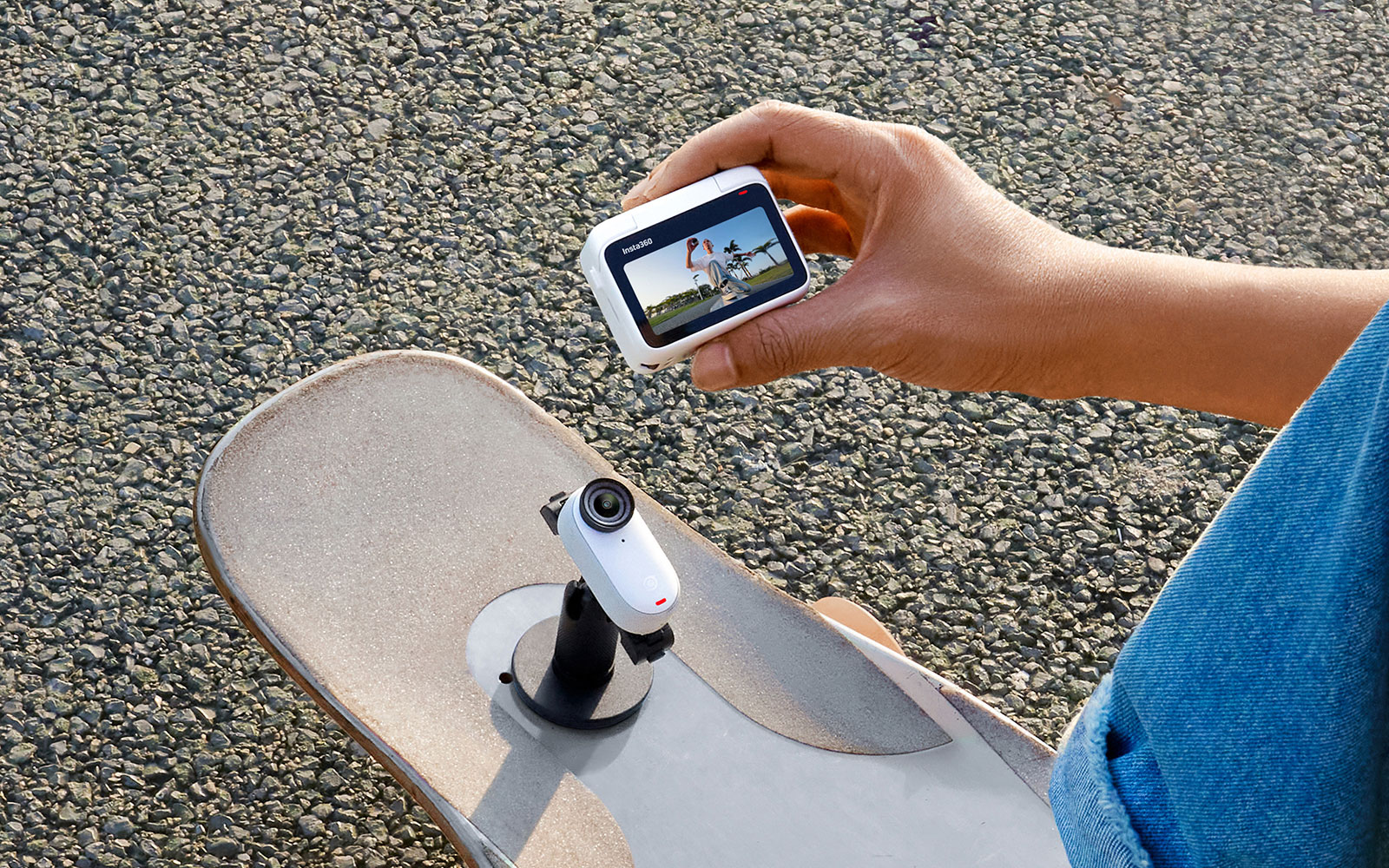 組合後,Go 3的續航時間從原來的45分鐘增加到了170分鐘,Action Pod的背後還有一個可以上下翻轉的2.2吋觸控螢幕。不管是組合狀態還是通過Wi-Fi連接,螢幕都可以即時顯示Go 3的拍攝畫面,使用者還可以在螢幕上調整相機設定(側面也有實體按鈕)。此外,Insta360在包裝中還附帶了一個轉向支架,可以將相機和Action Pod固定在上面。