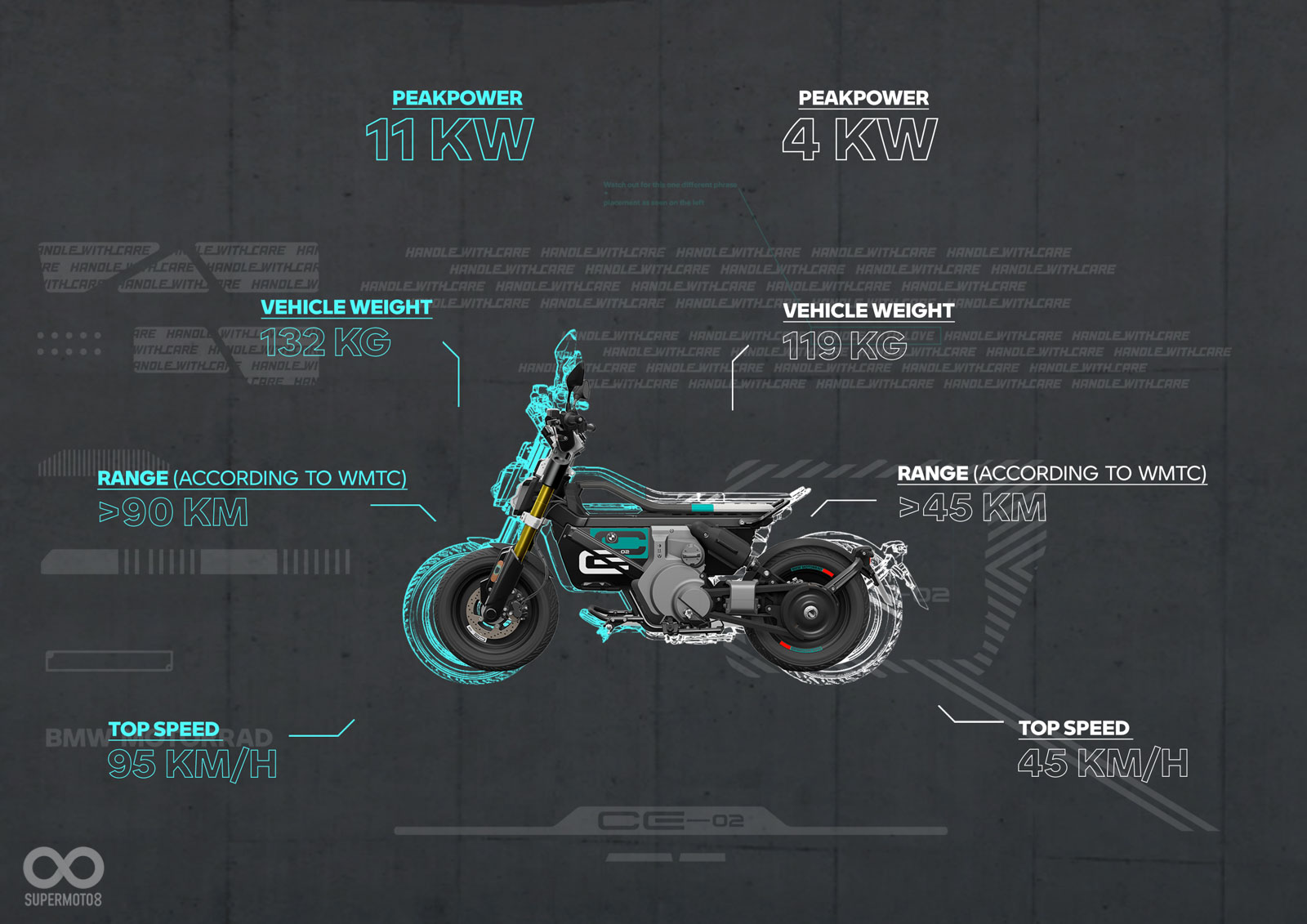 BMW CE 02提供兩個版本供選擇。首先是15匹馬力(11千瓦)版本,最高時速可達95公里/小時;另一個版本則是5匹馬力(4千瓦,額定功率為3.2千瓦),限速在45公里/小時,最大扭力為55Nm。