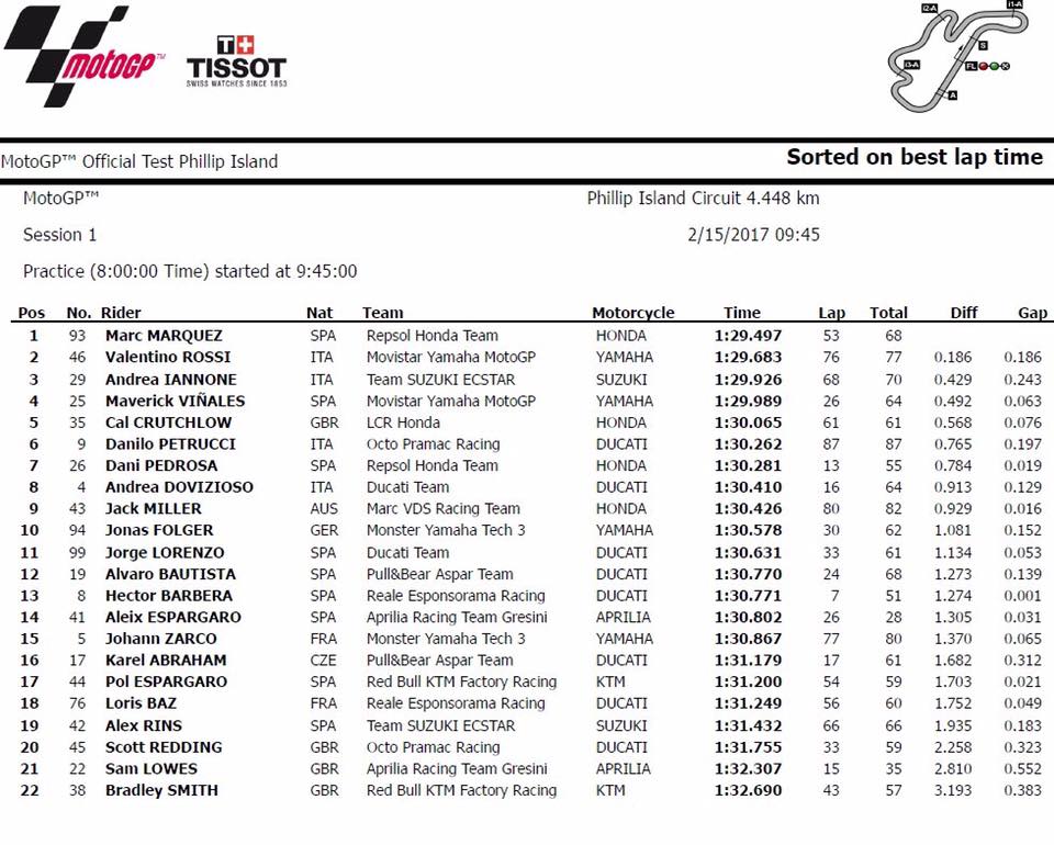 本週MotoGP團隊移師至澳洲的菲利浦島賽道,展開為期三天的官方季前測試,在第一天的測試中,衛冕冠Marquez展現出強大的統治力道,以1:29.497的成績位居榜首,而今天剛過生日的猴王則是小幅落後0.186秒位居第二,相較於前頭兩位的悠然自得,今年轉投至Ducati的Lorenzo則是遇到了一些麻煩,成績跌到了十名之外,讓我一起來看看他們對於今天的測試有些什麼樣的想法吧。