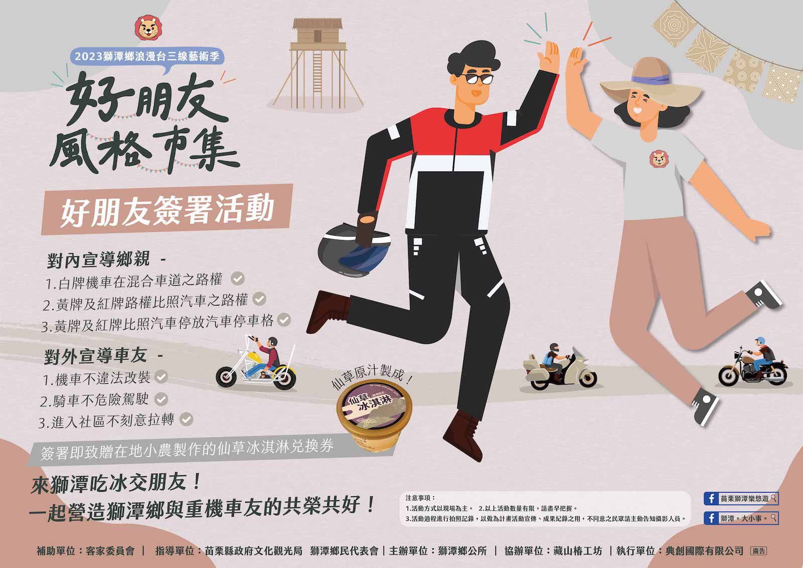 為了吸引車友在行經獅潭段可以放慢腳步,欣賞浪漫的台三線風景,同時也降低當地居民、商家與車友間的誤會,獅潭鄉公所特別在2023/8/26-8/27週末假日舉辦「好朋友風格市集」,活動邀請知名機車網紅 艾兒 在週六上午與大家見面,同時會場除了小點心與餐食攤位外,也有部分品牌車種、周邊商品展示,希望可以召集大量的重機車友與當地居民,在活動過程中宣導正確的交通觀念,也對居民宣導關於機車路權的細節。
