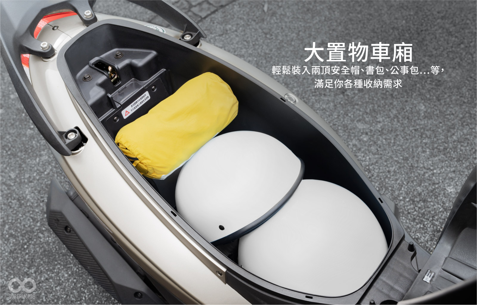 圖:迪爵125能輕鬆塞入一頂3/4安全帽外加一頂1/2安全帽,還有空間能收納雨衣等。