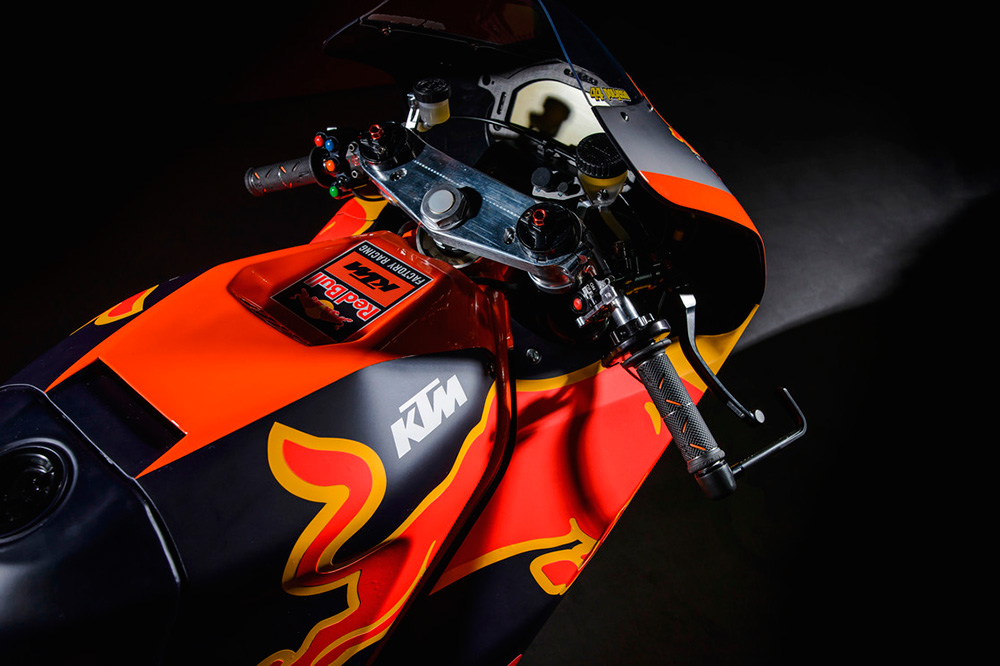 今年的戰車KTM RC16搭載一具990c.c.V形四缸引擎,馬力粗估超過270hp,點火方式也與其他車隊不同,使用馬力延伸性較好等間距點火,而在車架方面KTM也有自己的堅持,是全場唯一使用鋼管編織車架的廠隊。
