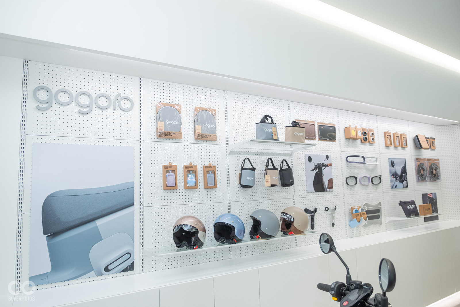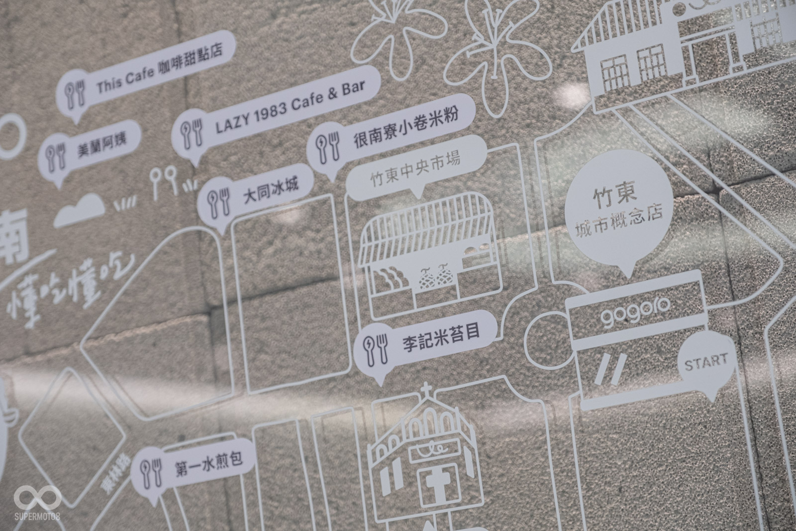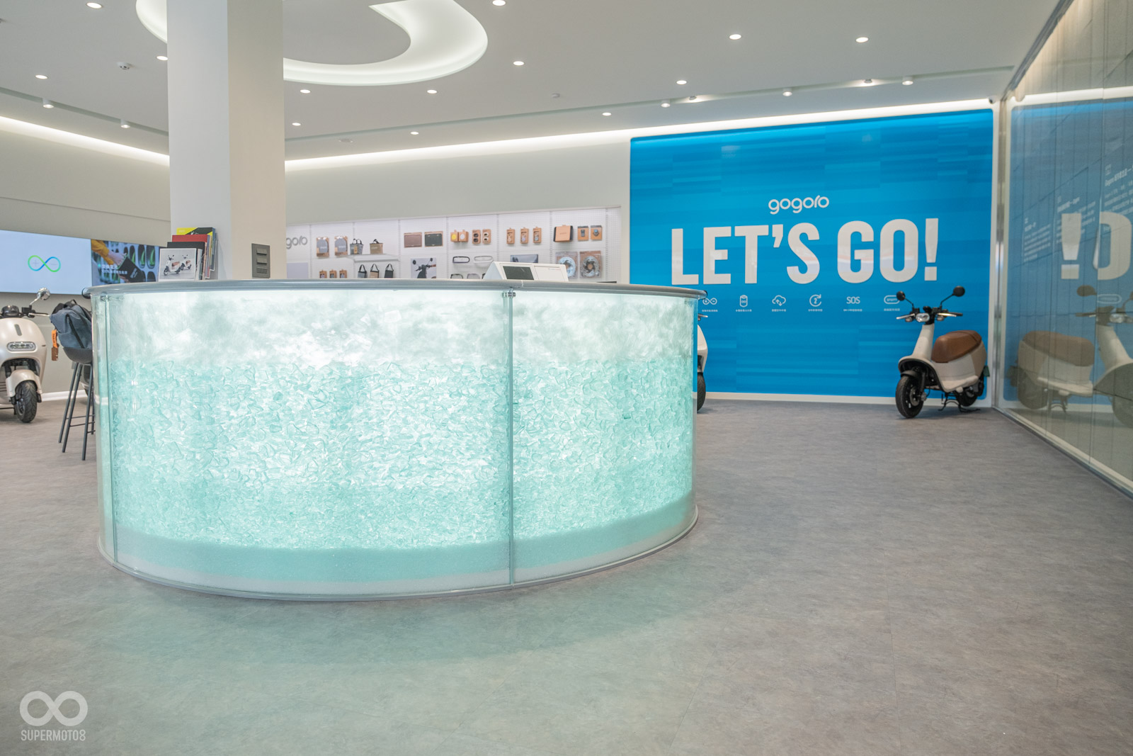走入店內則會發現以 Gogoro Network 無限符號為靈感的環形透明吧檯,由大量回收玻璃面板及各類再生玻璃壓碎堆疊而成,搭配各色玻璃光影點綴敞亮的開放式展區,完整陳列 Gogoro 熱銷車款、精品配件,讓。部分牆面更採用再生輕質節能磚,同時為了強化城市概念店意涵,原廠也設立美食地圖資訊在店家牆面上,強化車友與新竹竹東的互動性。