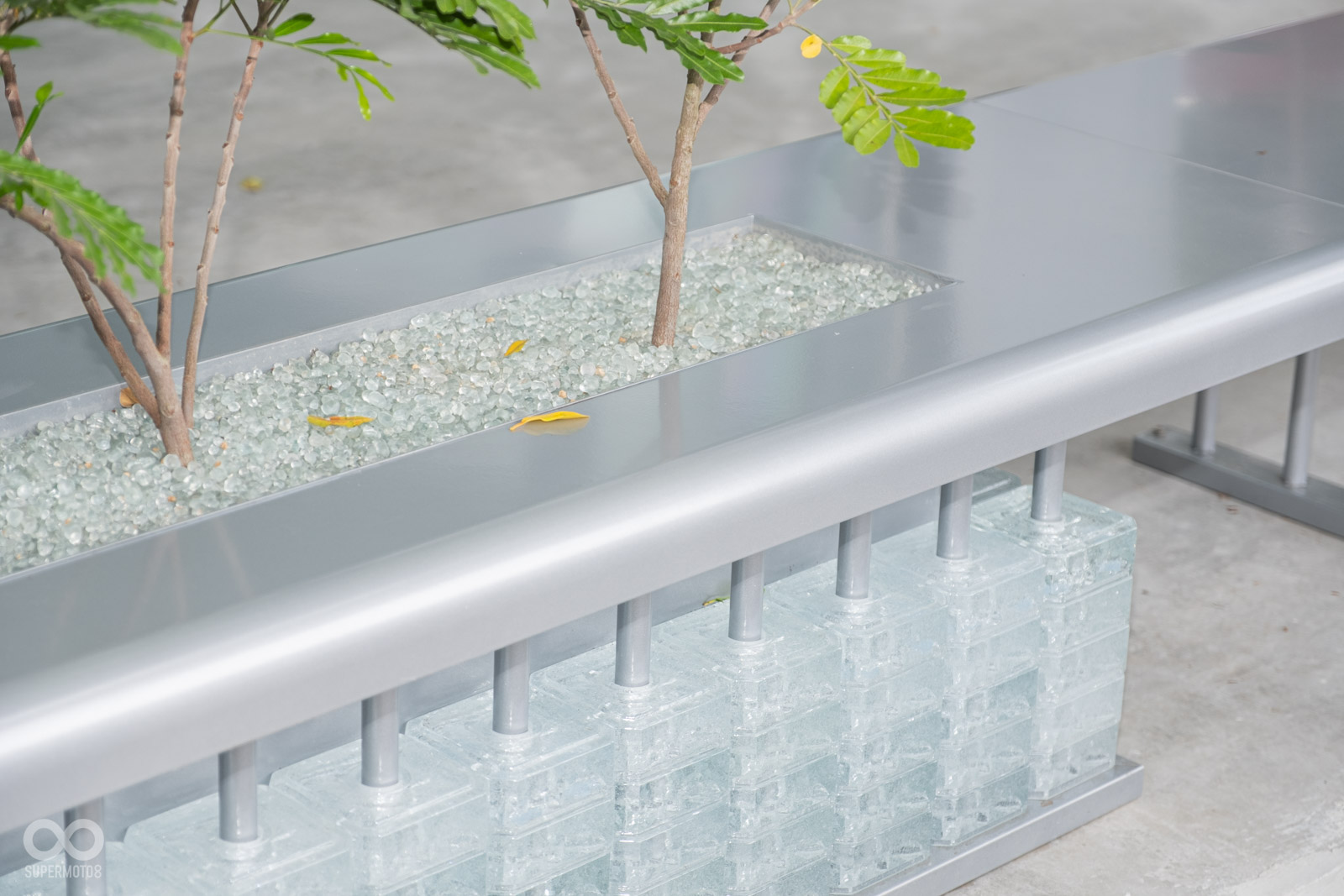 「Gogoro 城市概念店」首間門市選在新竹竹東設點,全店設計結合新竹當地品牌春池玻璃,除了彰顯玻璃對於新竹的產業重要性外,也恰好配合玻璃可100%回收的環保特質;全店從外觀細節例如花台與座椅,就導入玻璃元素設計,甚至外頭斗大的Gogoro字樣,同樣使用玻璃材質呈現。