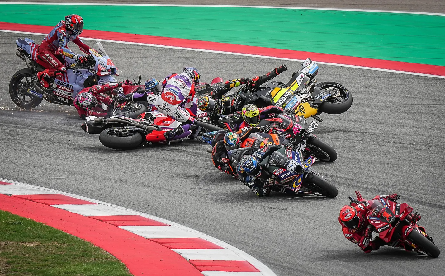 今年的正賽,被判罰退位的Enea Bastianini從第十四位起跑後,一路沿著賽道內側高速進入第一彎,由於速度過快加上前輪失去抓地力,進而轉倒將周圍的Johann Zarco、Alex Marquez、Fabio di Giannantonio以及Marco Bezzecchi通通給帶了出去。