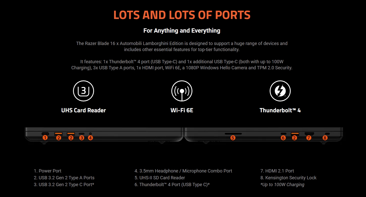 螢幕是一件藝術品,具有4K解析度和雙模式Mini-LED技術,具有精確性和多功能性。散熱設計的創新使其即使在強烈的遊戲中也能保持涼爽;Razer Blade 16 x Automobili Lamborghini Edition增加了奢華感,具有個性化細節和標誌性RGB照明。