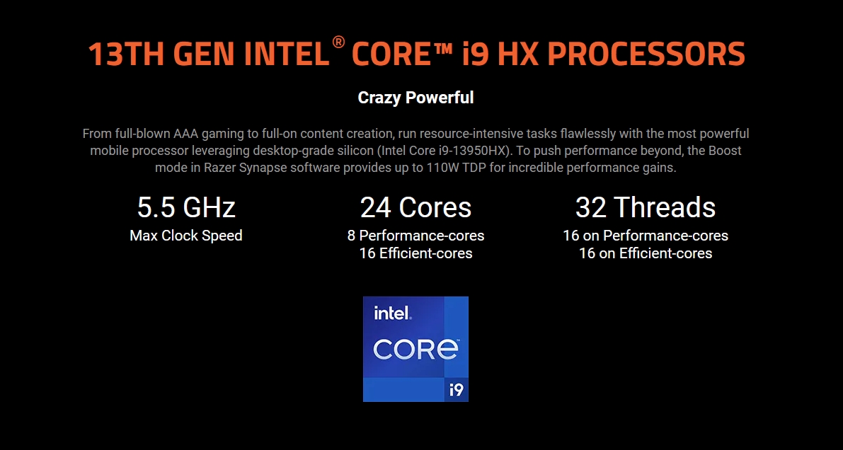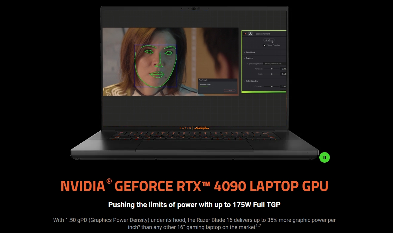 Razer Blade 16是遊戲玩家和創作者的最佳選擇。它採用NVIDIA® GeForce RTX™ 4090筆電GPU,提供無與倫比的圖形性能,功率提高了35%。創意人士將欣賞RTX光線追蹤和AI加速功能,用於頂級創意應用程式,而遊戲玩家則可以享受5.5 GHz的第13代Intel® Core™ i9 HX處理器。