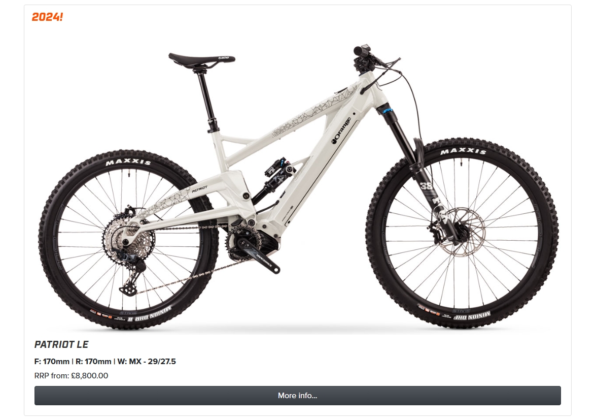 Orange自行車公司於1990年代末推出了Patriot登山車,很快就被英國的Team Animal車隊接受,成為“許多下坡車手的首選”。這款暢銷自行車的最後一次改款是在2012/2013年;新的LE款式延續了這一傳統,但成為了一款E.P.O.(Electric Powered Orange)自行車,它以Bosch Performance Line CX馬達為核心,提供四種輔助模式,並且可以通過手機APP進行調整。