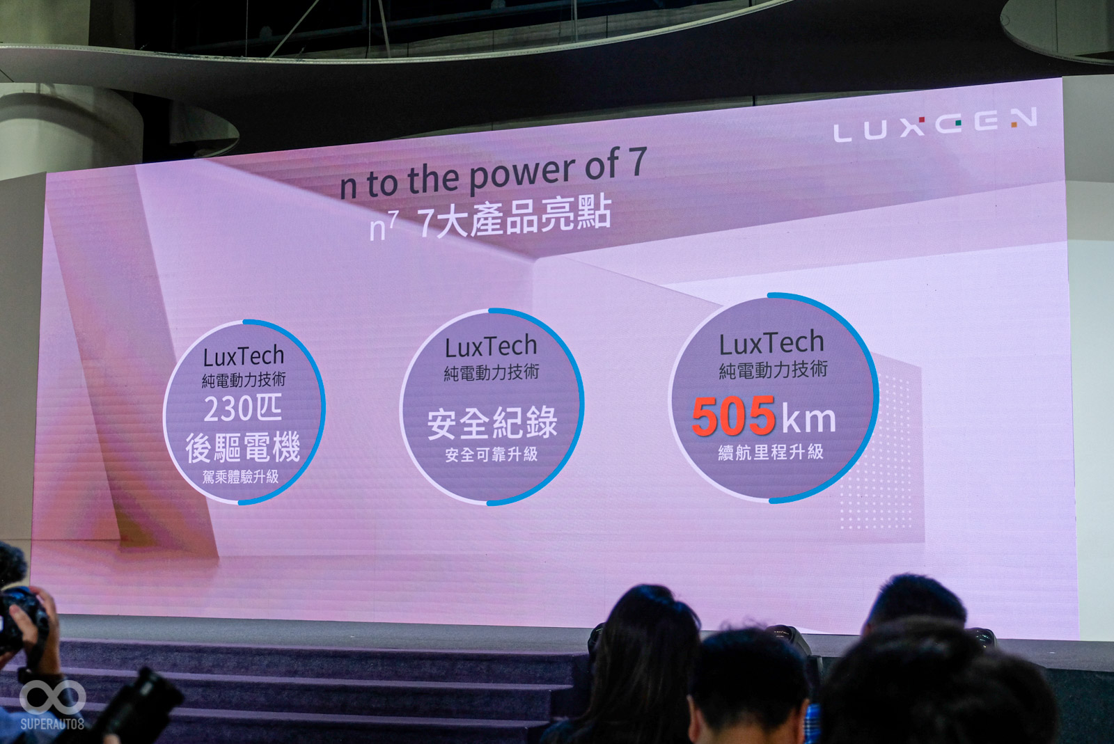 n⁷在不斷調校精進後,正式送測取得的續航里程更升級至505公里!LUXGEN董事長左自生特別感謝n⁷專案會員們和各方合作夥伴的支持,宣示隨著全產品線步入「純粹亮點」世代,服務也將煥然一新,以「無限可能」的全新品牌內涵出發,推出「電抵家」專業家充服務與「LUXLIFE」多元保修服務,整合裕隆集團最完整的全域移動服務資源,與您的美好生活結伴同行!