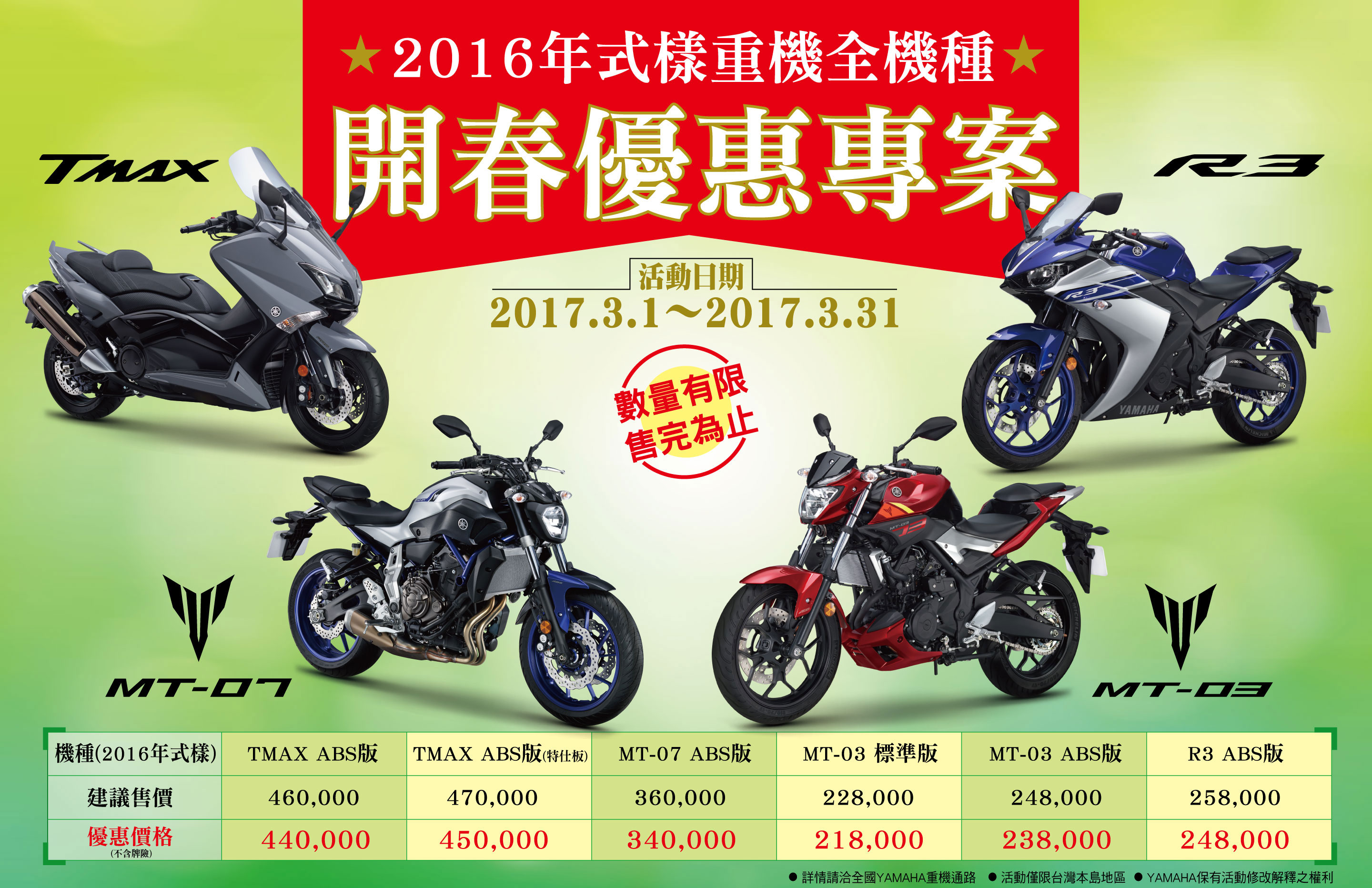 Yamaha推出開春優惠專案,3/31前購買2016年跨年度黃紅牌重機,特價實施中,R3、MT-03降價一萬元,MT-07、TMAX降價兩萬元,想要撿便宜又不在意年份的車友,快前往經銷商詢問吧~
