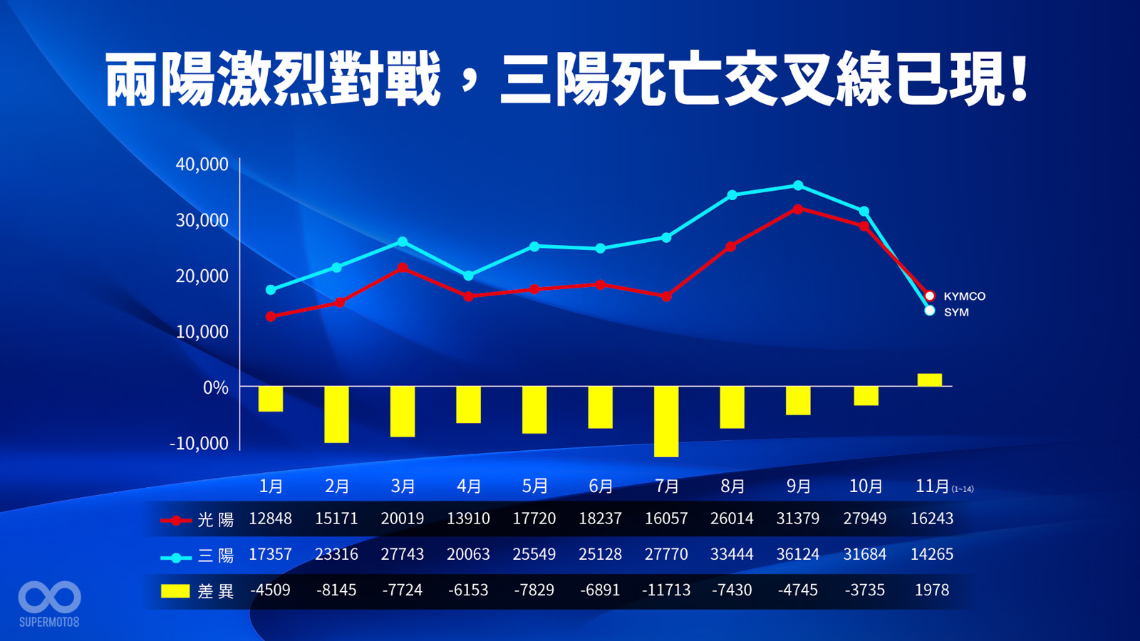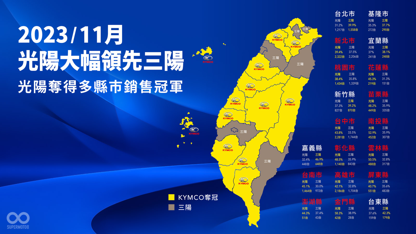 多點佈局的搶市策略、使KYMCO的品牌氣勢旺到最高點,與同業競爭白熱化。市占率一路纏鬥,緊縮彼此差距,讓光陽11月上半月以16,243輛銷售台數領先同業5%,在14天內平均市占達到40.77%!隨著狂銷全台的GP125穩定交車、四大款轟動新車口碑持續發酵,從9月、10月只是拉近成績差距,光陽目前在市占率保持領先超越同業;正常狀態下,有機會在各界期待下於11月超車同業,獲得機車市場的冠軍,讓光陽喊出的2024年雙料冠軍目標能再進一步,穩步前行。