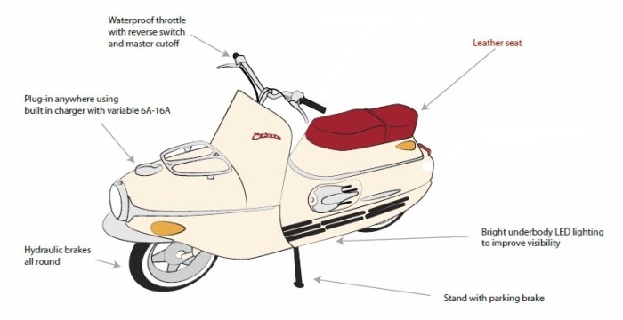 Type 506車身採用鍍鋅鋼結構搭配複合纖維製成,以鍍鉻零件點綴細節,車身顏色有單色與經典雙色可以選擇,坐墊更選用真皮製作。凸出的車頭裡本來是油箱,改用電動馬達後打開油箱蓋即可拉出充電插頭,直接插上家用插座(歐規)進行充電,90V-260V 間的電壓皆可適用。