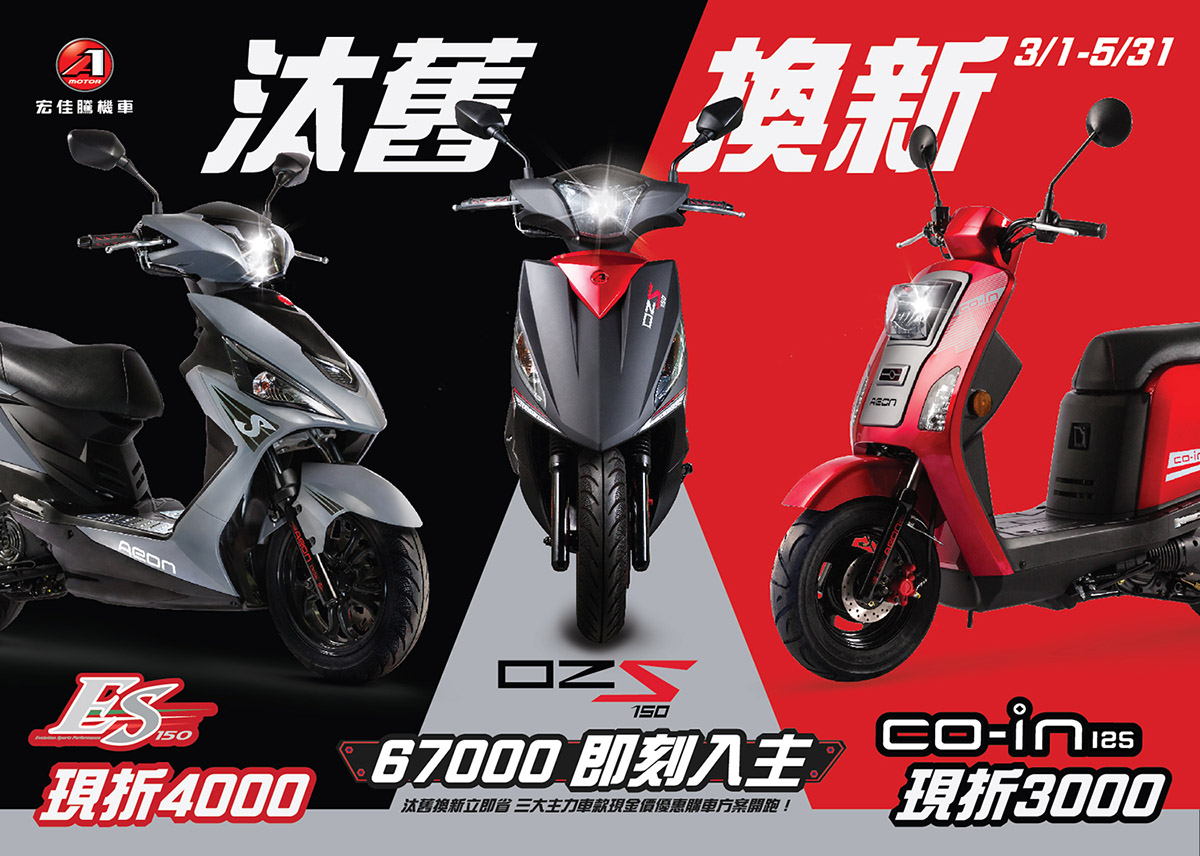 宏佳騰3月推出汰舊換新方案,買車就送價值3500元丟車賠車險一年 (3D-350除外),另外三大主力車款也分別推出不同優惠。科技感十足的LED魚眼頭燈,加上義大利合作設計的4V滾針搖臂噴射引擎,魅力五色任意選的「品牌旗艦車款ES150」現在獨享優惠20分期,現金購車再享折價4000元優惠,只要78000元就能辦到好 ( 不含福音戰士特仕車 )。「CP值之王OZS150」則是擁有與義大利合作的競速動力系統、4V滾針搖臂的噴射引擎,全新設計高效能雙球燃燒室搭配最佳化的正時點火技術、排氣道優化技術,使引擎效能大幅提升,用買125cc的價格,即可買到150cc的重裝配備,另有17年新色-潮流黑初登場,現在現金價只要67000元,CP值再升級。而小資族最愛、時尚外觀、舒適性與操作靈敏度極佳的「co-in125」,搭配雙色變換液晶螢幕、微笑定位燈、LED花朵造型方向燈等,整體亮麗有型,汰舊換新申請成功辦到好也是57,200元立即擁有。