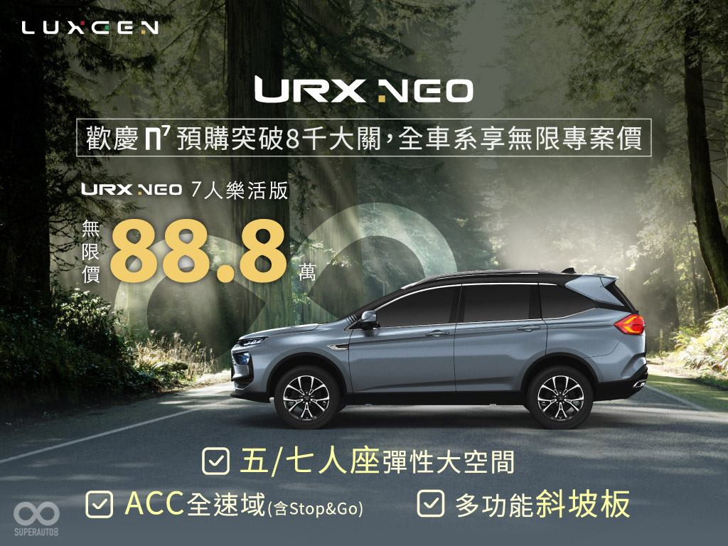 深受家庭喜愛的URX NEO,更是以不到90萬的超值優惠,同時擁有高顏質、高馬力、高科技、大空間,以及標配ACC全速域主動車距巡航功能(含Stop & Go)的智慧安全科技,全方位滿足家庭生活、戶外休閒、樂活無障礙等多元需求,讓每位乘員都可成為多采多姿的大生活家;LUXGEN為讓每個家庭都能輕鬆擁有愜意舒適的完美旅程,12月祭出主力車款-「URX NEO 7人樂活版」可享∞無限專案價88.8萬元(原售價99.8萬),好禮回饋最高省11萬!LUXGEN今年最後一檔超值購車優惠火熱開跑,敬邀您親臨全台LUXGEN汽車生活館鑑賞,以最親民的價格,讓您的夢想成真。相關優惠詳情或其他購車資訊,歡迎至LUXGEN官網預約來店賞車,或電洽客服專線0800-588-088。