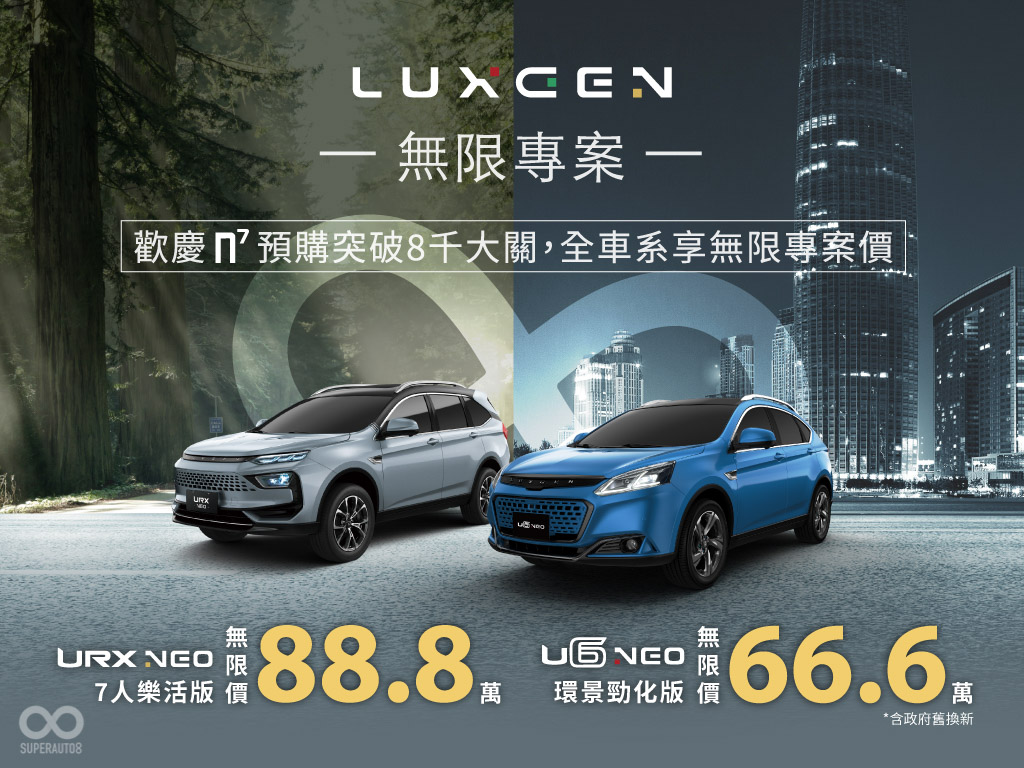 適逢2023歲末年終感恩時刻,LUXGEN感謝消費者一直以來的支持並歡慶LUXGEN n⁷預購超過8,000台的破紀錄佳績,無限感恩!無限回饋!特別於12月份延續「∞無限專案」活動(1),自12/1(五)~12/29(五)止,針對旗下U6、URX熱銷指定車型,推出年終大回饋,購車優惠最高可省17萬元(含汰舊換新貨物稅補助)(2),不僅讓您能以不到70萬的入門小型休旅價格即刻享有U6 NEO中型休旅車格,享受房車所沒有的高視野與大空間,和充沛的動力,或者擁有多變大空間及高科技安全配備的URX NEO指定車型 ,讓您輕鬆享無限專案價 88.8 萬(原售價99.8 萬)入手無負擔,更是乘載著全家人出遊最安心的極佳選擇。敬邀所有喜愛LUXGEN的準車主們,把握今年最後一檔購車優惠!
