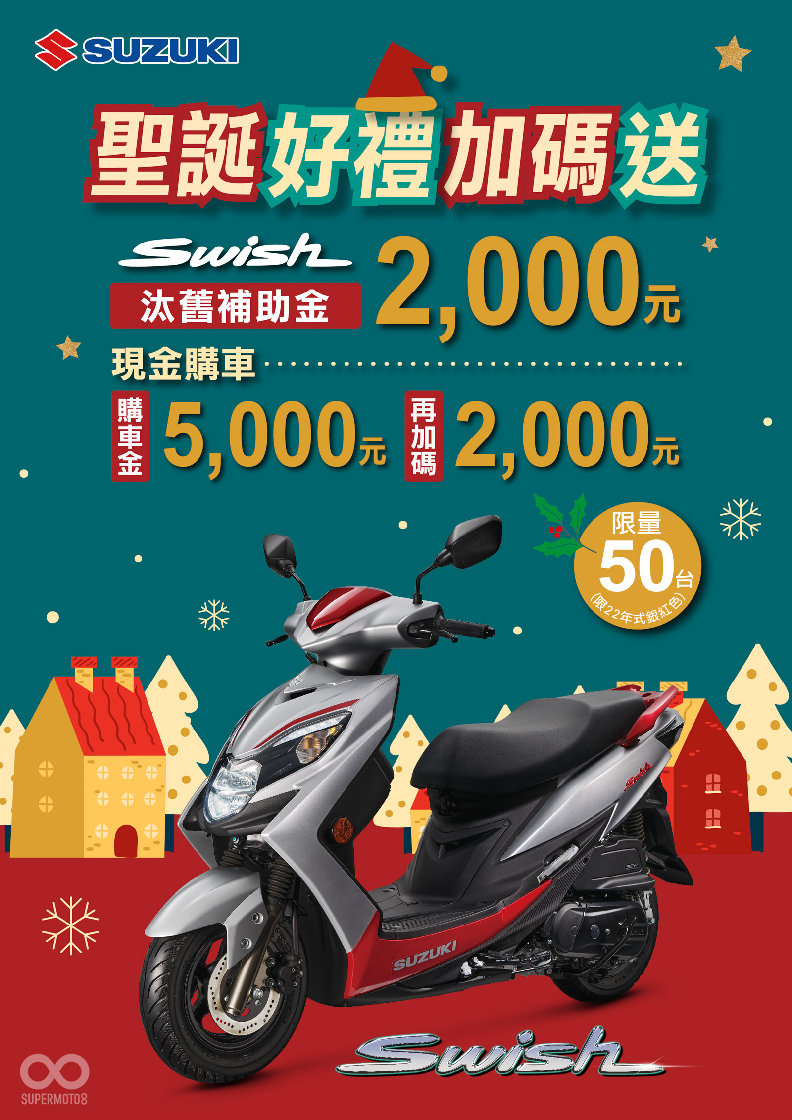 為讓各位準車主有更濃厚的聖誕氣氛,SUZUKI台鈴機車針對Swish 125銀紅色推出限量再加碼!於活動期間購買Swish 125銀紅色,即享現金購車優惠5,000元,分期購車享36期0利率,汰舊換新除享政府補助外,台鈴再加碼2,000元,聖誕再加碼2,000元,最高補助達15,300元,再贈送安心丟車賠車險,限量50台!給各位準車主最大的聖誕驚喜。