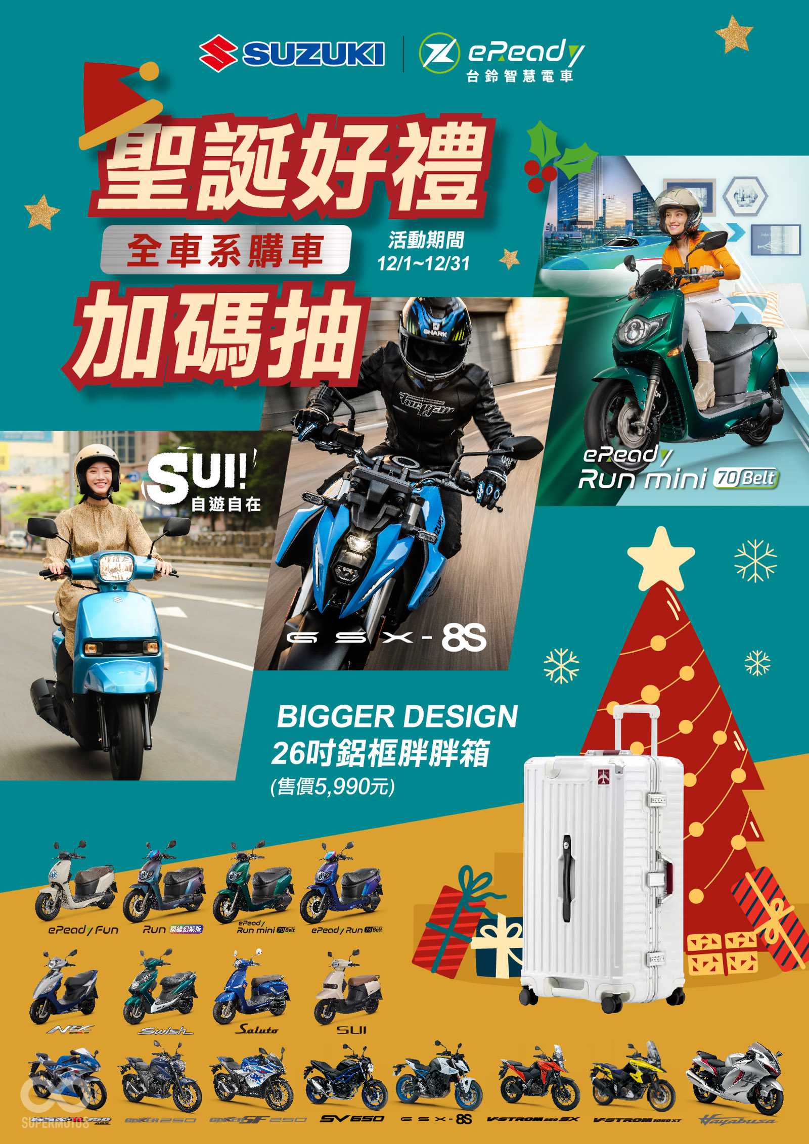 佳節將至,SUZUKI台鈴機車與所有喜愛SUZUKI的準車主們一同歡樂,於活動期間內購買台鈴工業所屬之精選白牌機種、進口大型重車、eReady台鈴智慧電車並完成領牌手續,將可自動獲得抽獎資格,將抽出『BIGGER DESIGN 26吋鋁框胖胖箱(價值5,980元)』,共10名,讓你新車新氣象,好心情隨時帶者走。