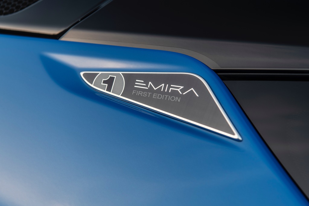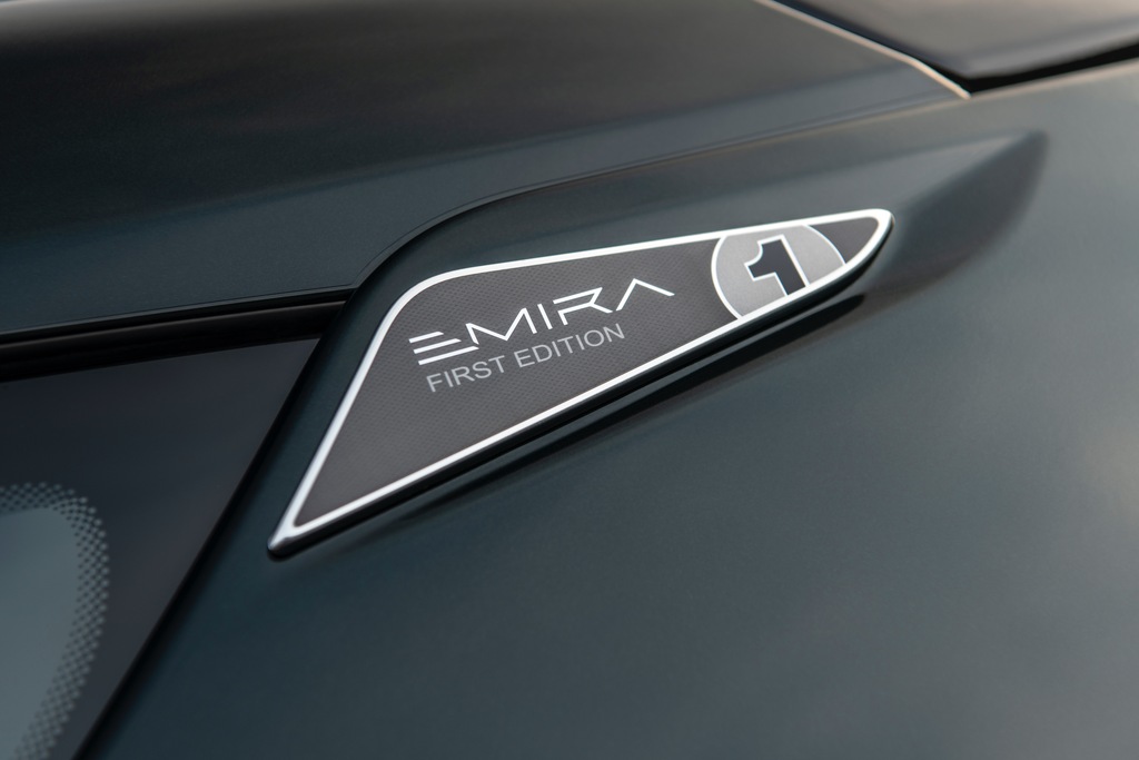 細品Emira V6 First Edition絕色外觀,可見車身下部飾以亮黑色外觀造型套件、直列式Led大燈、Led車尾燈、加熱式電動折疊後視鏡、鈦色排氣管尾飾管及車身C柱旁飾有標示車款名稱的銘牌飾板。寬闊的輪拱則標配有20吋V-Spoke forged alloy V輻輕質鍛造鋁圈,鑽石切割面設計,營造出優質的雙色調飾面,共有銀色及亮黑色可供選擇。帶有品牌字標的兩片式高性能煞車碟盤也是初始版車式的的一環,並外加有胎壓偵測器(TPMS)。外觀漆色並包含多種色彩選擇,如:發表色Seneca Blue藍、Hethel Yellow黃、Dark Verdant綠、Shadow Grey灰等可依車主喜好發揮絕佳創意。