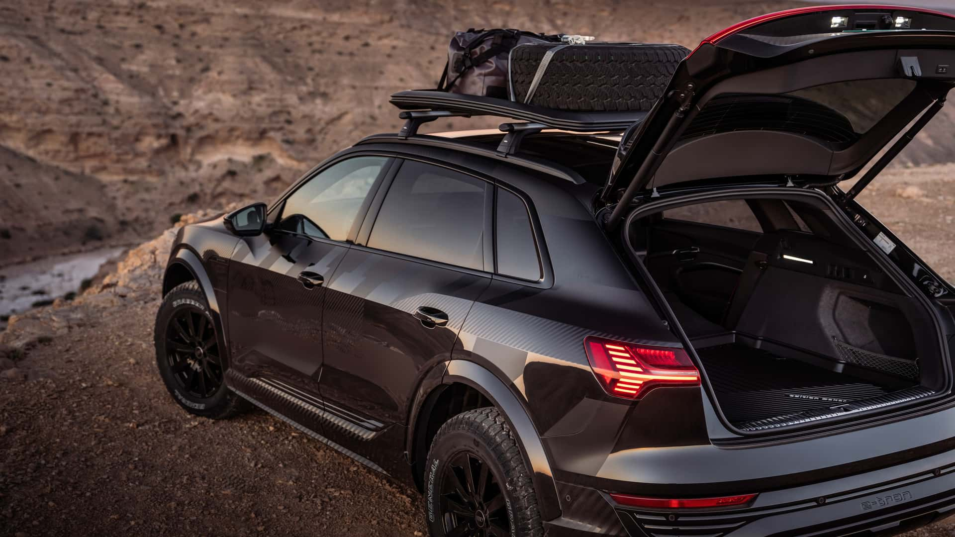除了底盤硬體的升級外,Q8 e-tron Dakar Edition還提供一個可選配的車身彩繪套件,以呼應RS Q E-Tron的風格。原廠預計限量推出99輛,全部塗裝成神秘消光黑色,並在部分車身表面覆蓋透明彩繪膜。此外,客戶消費者還可以選配將這款電動SUV改成灰色、米色或黑色等額外塗裝;車頭前方也能客製化安裝LED燈,車頂行李架為標準配備,最重可乘載40公斤左右物品。
